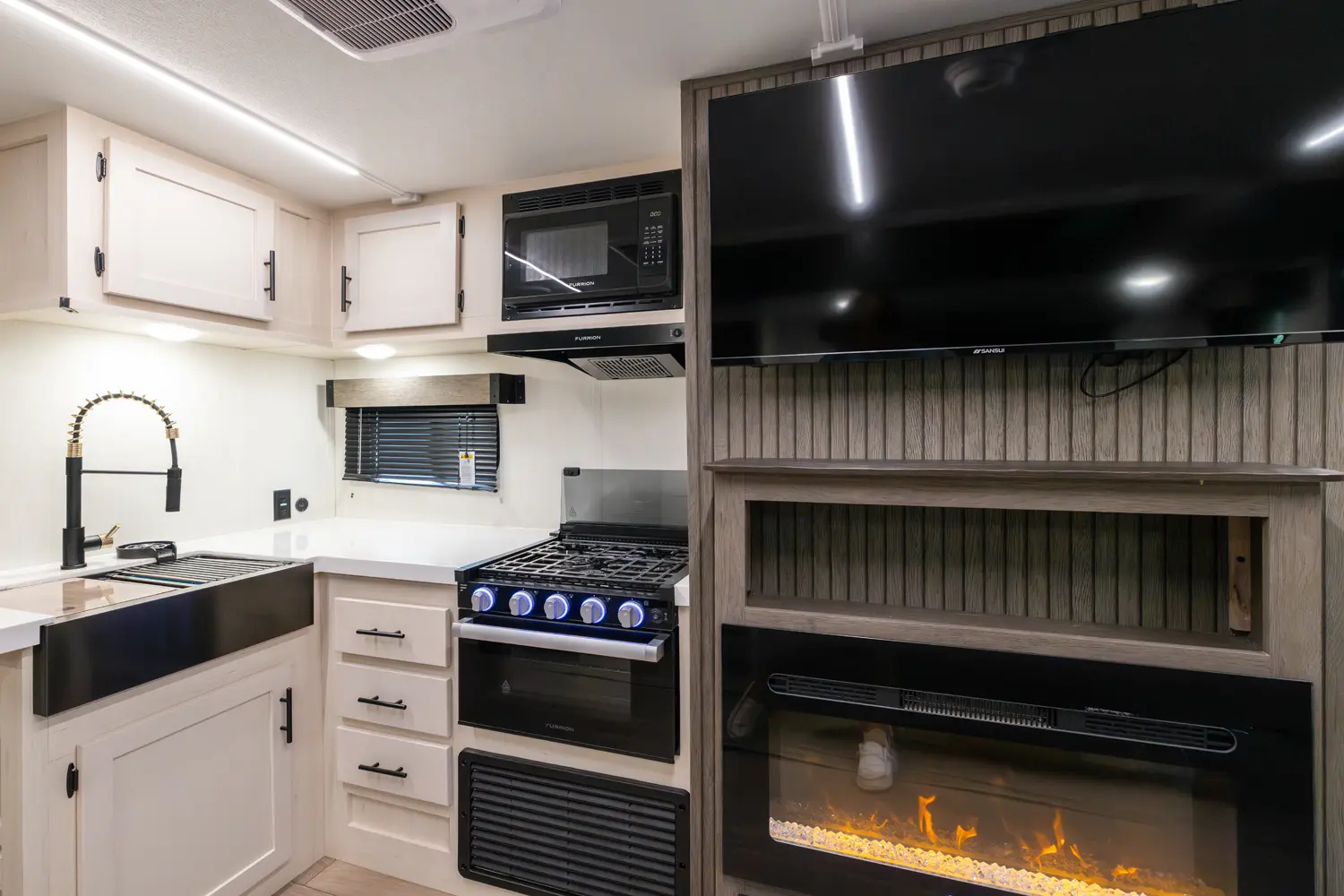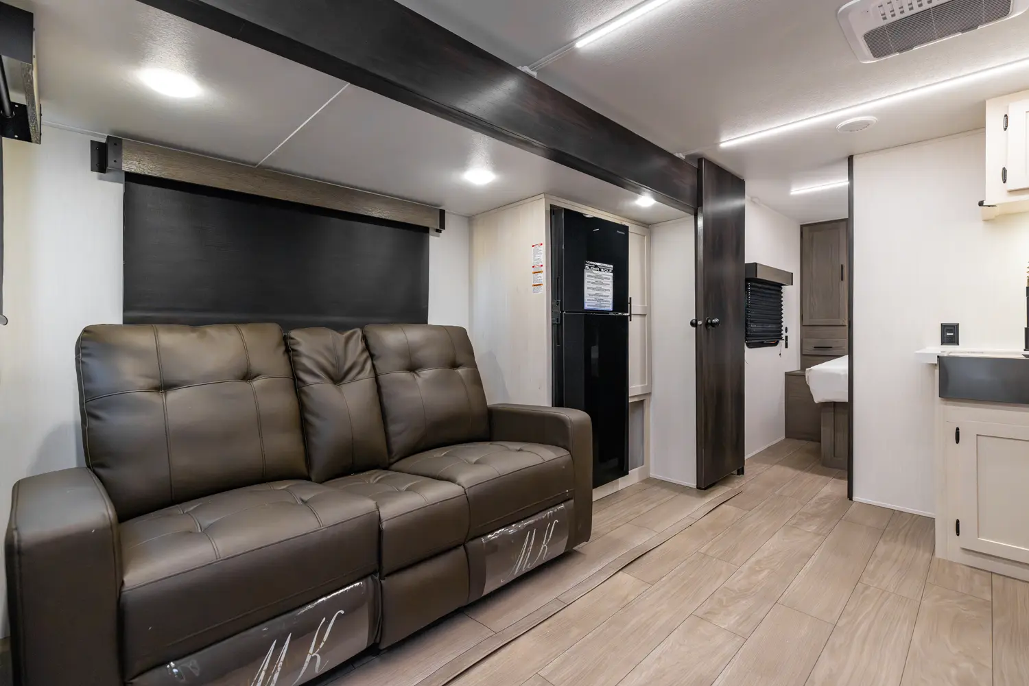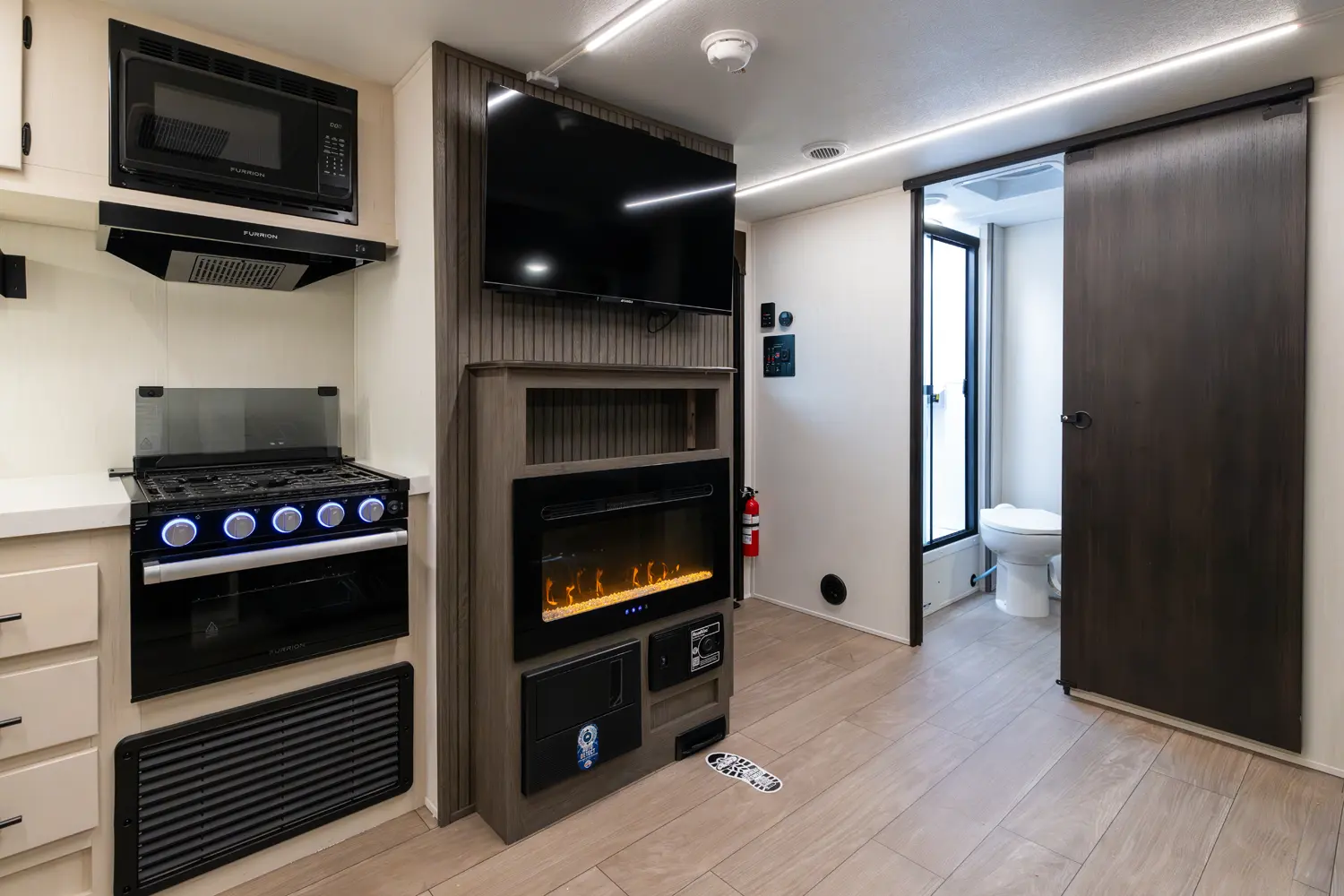 Meet the Alpha Wolf 22SW by Forest River; a lightweight 27ft travel trailer that's PACKED with big amenities! Relax in the theatre seats directly across from your cozy fireplace and entertainment center. There's also a removable table that connects to the sofa when it's time for a meal. The kitchen features a walk-in pantry, 12-volt refrigerator, farm style sink, oven, microwave and lots of storage. In the rear is a full bathroom and up front you'll find a queen bed and two wardrobes.