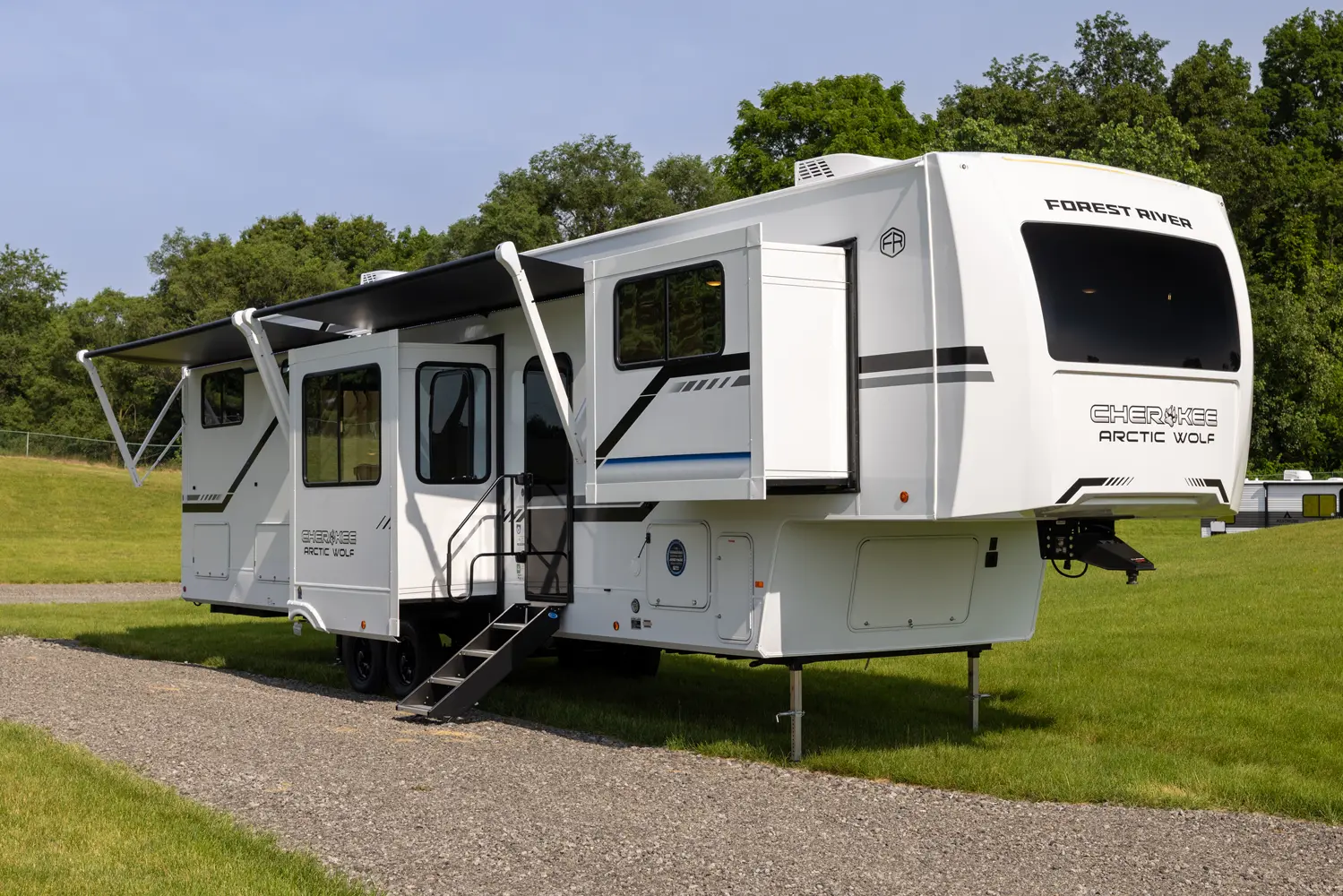 If you enjoy entertaining guests, you're going to love the Arctic Wolf 3950SUITE by Forest River! Our front living room features two tri-fold sleeper sofas and relaxing theatre seating directly across from the cozy fireplace. The island kitchen is highlighted by two 10 cu. ft. refrigerators, 30" microwave, oven, dinette seating and a half bathroom. In the primary suite you'll find a king size bed, fireplace, ample wardrobe space and an incredible bathroom with washer and dryer prep.