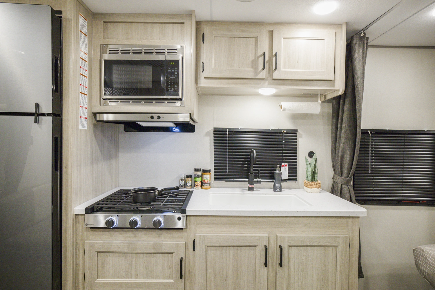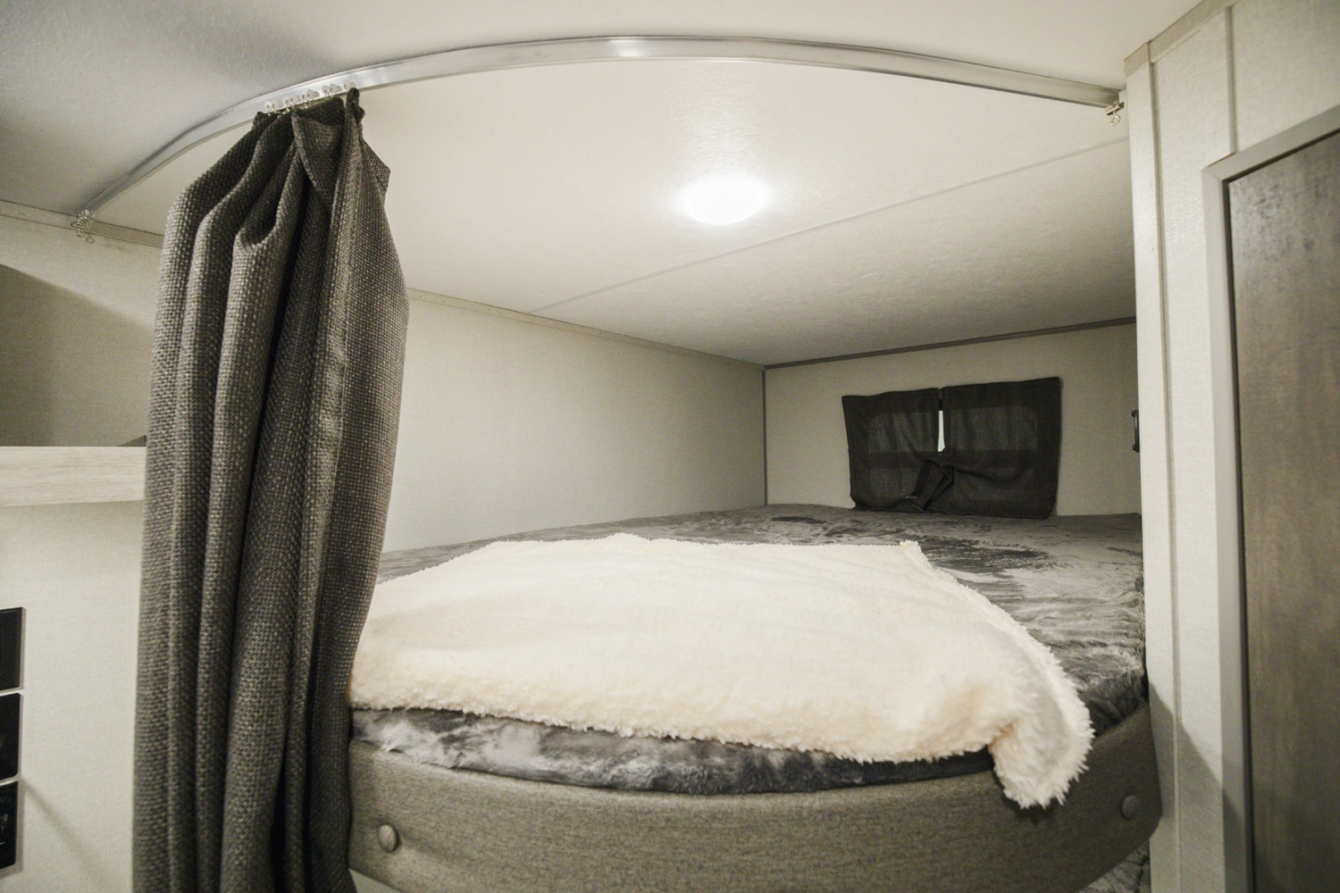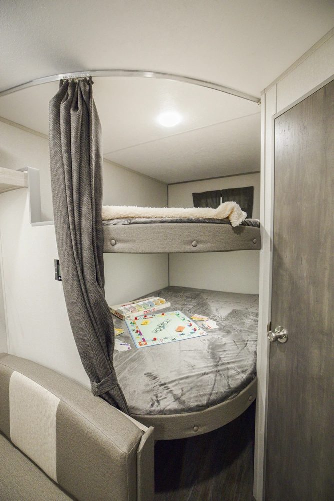 Stretching into mid-size territory, this trailer expands living and sleeping space for small families or groups. Bunk-style sleeping and a functional kitchen give flexibility, making it a dependable choice for weekend retreats or short-term getaways.