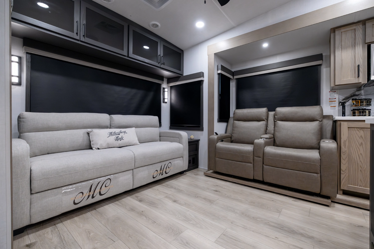 This luxurious rear living floorplan features a 78" hide-a-bed sofa, 60" theater seating, and a fireplace with TV for cozy relaxation. The spacious kitchen offers an island, pantry, and outside kitchen with griddle. The private front bedroom includes a king bed, dresser, washer/dryer prep, and wardrobes. With dual awnings, pass-thru storage, and premium finishes throughout, it’s perfect for extended stays or weekend adventures.