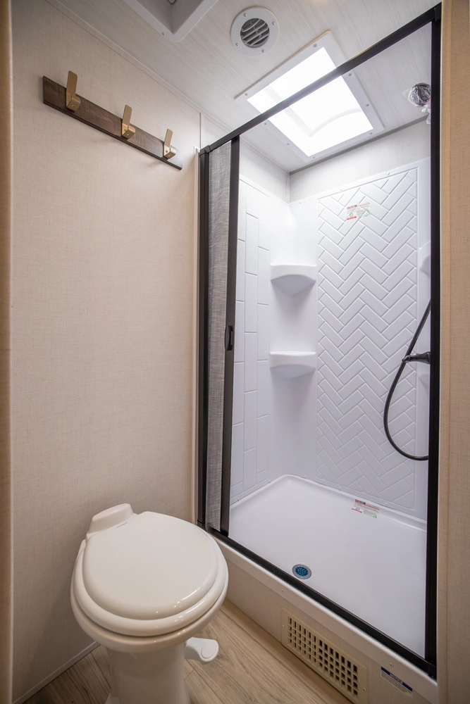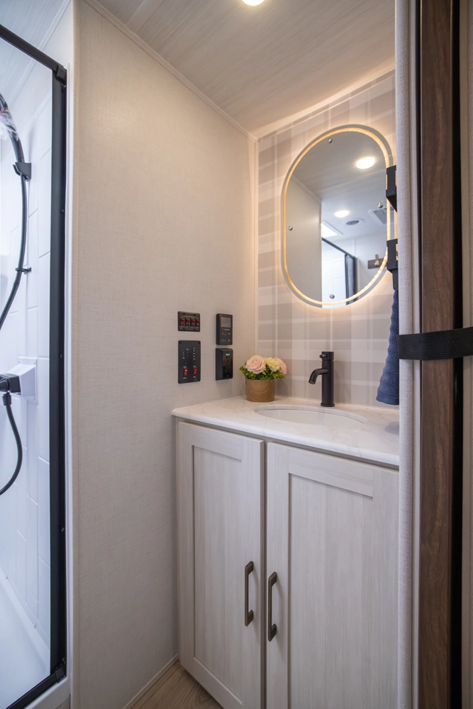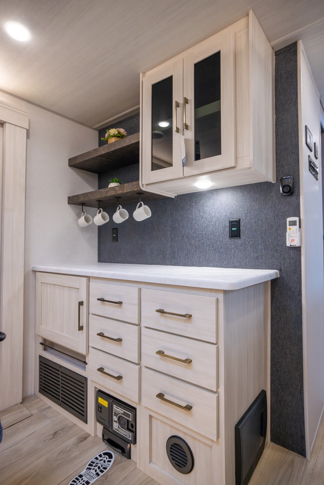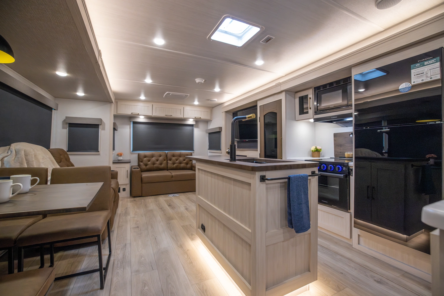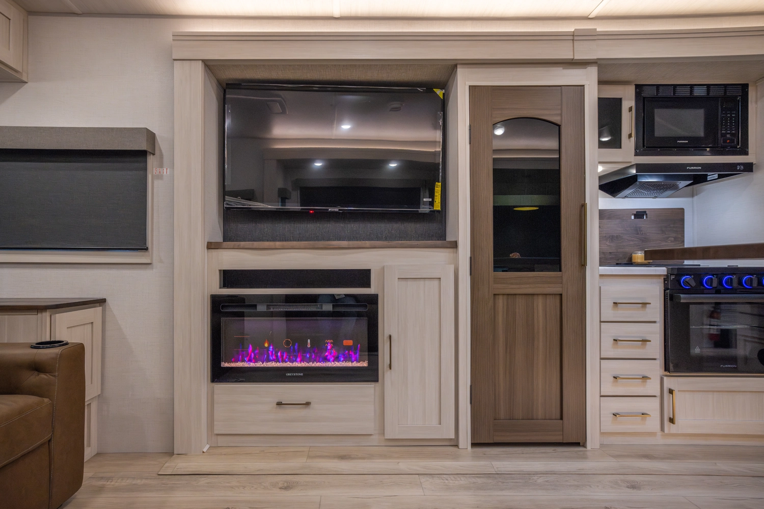 This 38' 10" travel trailer features a front private bedroom with a king bed and ample storage. The rear living area includes a sofa, theater seating, and a fireplace. The kitchen boasts a central island with sink, pantry, and a 10 cu. ft. 12V refrigerator with oven and stovetop. Exterior features include dual electric awnings, outdoor camp kitchen, and a hot & cold spray port.