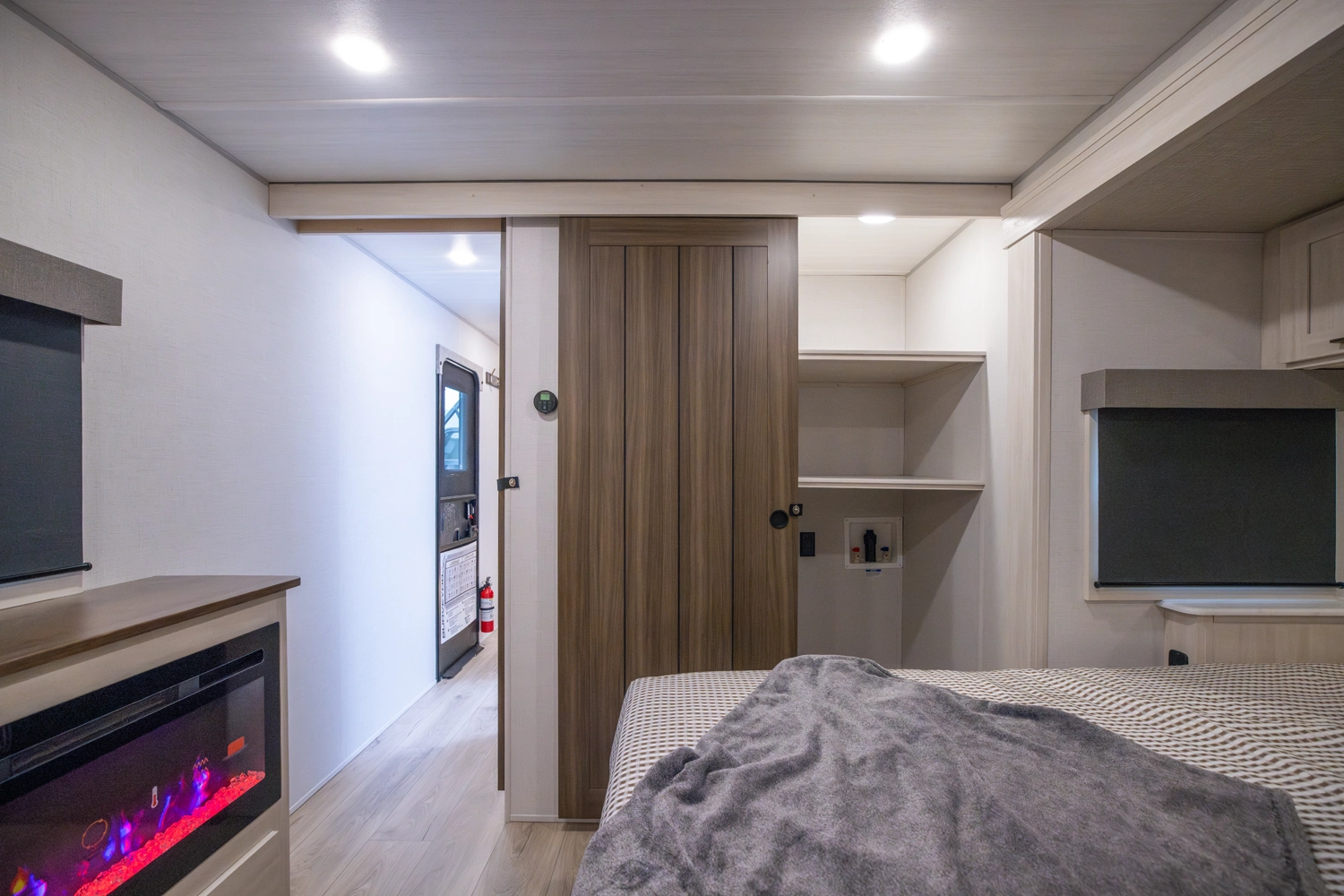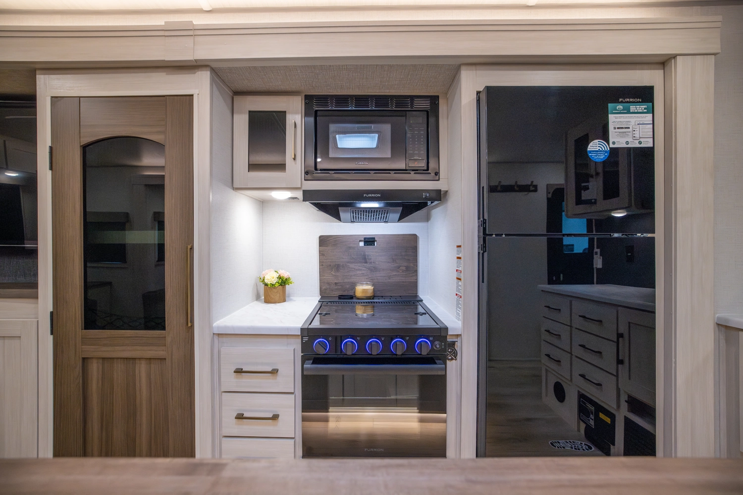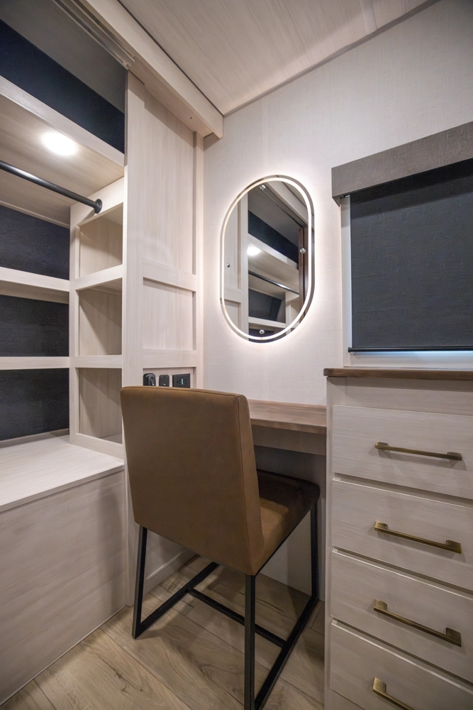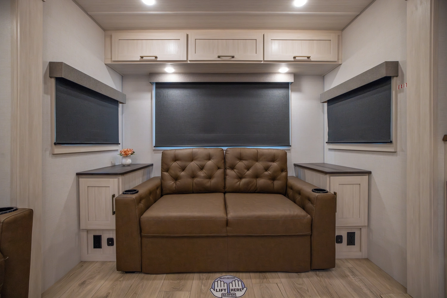 This 38' 10" travel trailer features a front private bedroom with a king bed and ample storage. The rear living area includes a sofa, theater seating, and a fireplace. The kitchen boasts a central island with sink, pantry, and a 10 cu. ft. 12V refrigerator with oven and stovetop. Exterior features include dual electric awnings, outdoor camp kitchen, and a hot & cold spray port.