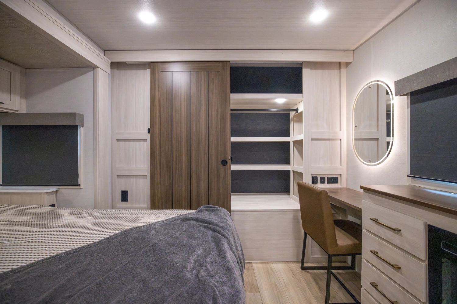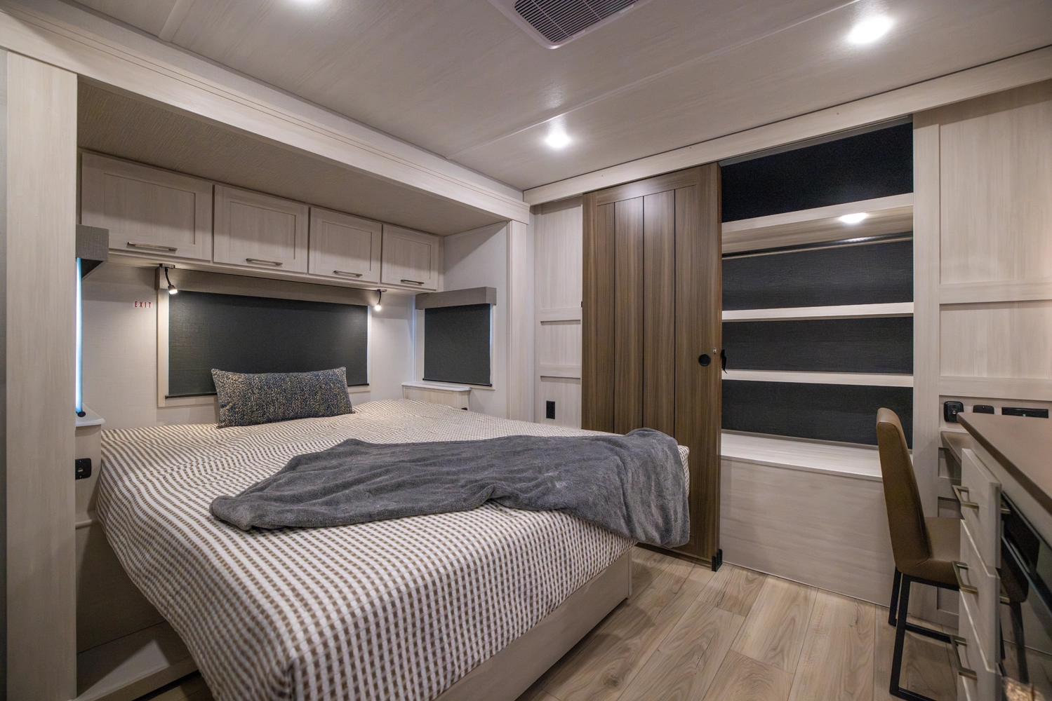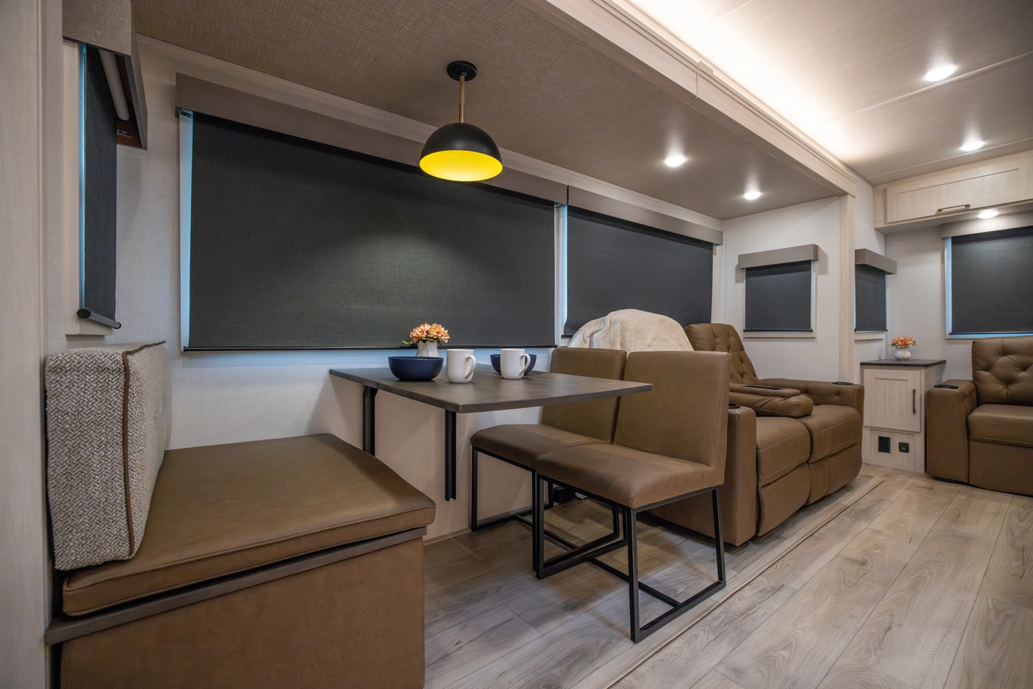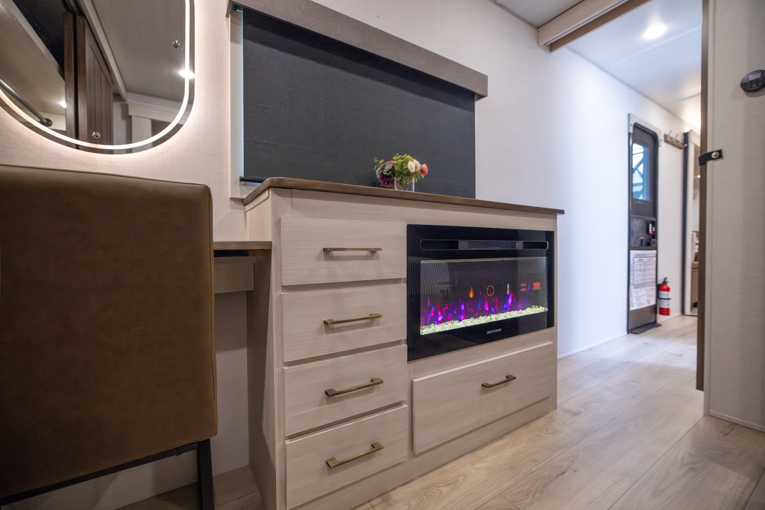 This 38' 10" travel trailer features a front private bedroom with a king bed and ample storage. The rear living area includes a sofa, theater seating, and a fireplace. The kitchen boasts a central island with sink, pantry, and a 10 cu. ft. 12V refrigerator with oven and stovetop. Exterior features include dual electric awnings, outdoor camp kitchen, and a hot & cold spray port.
