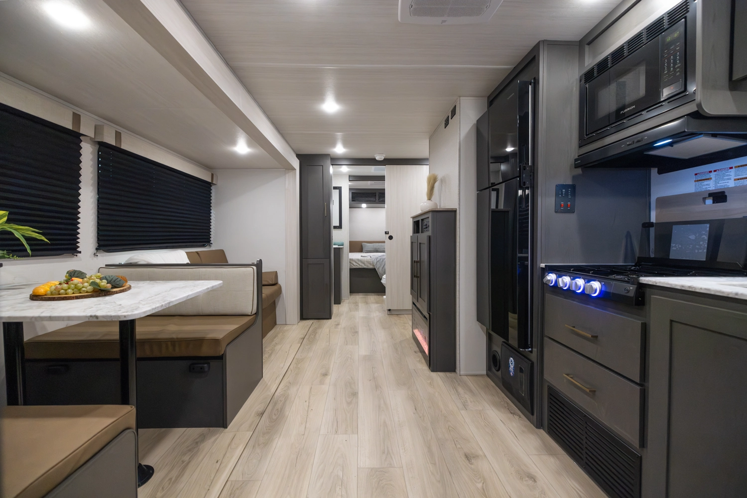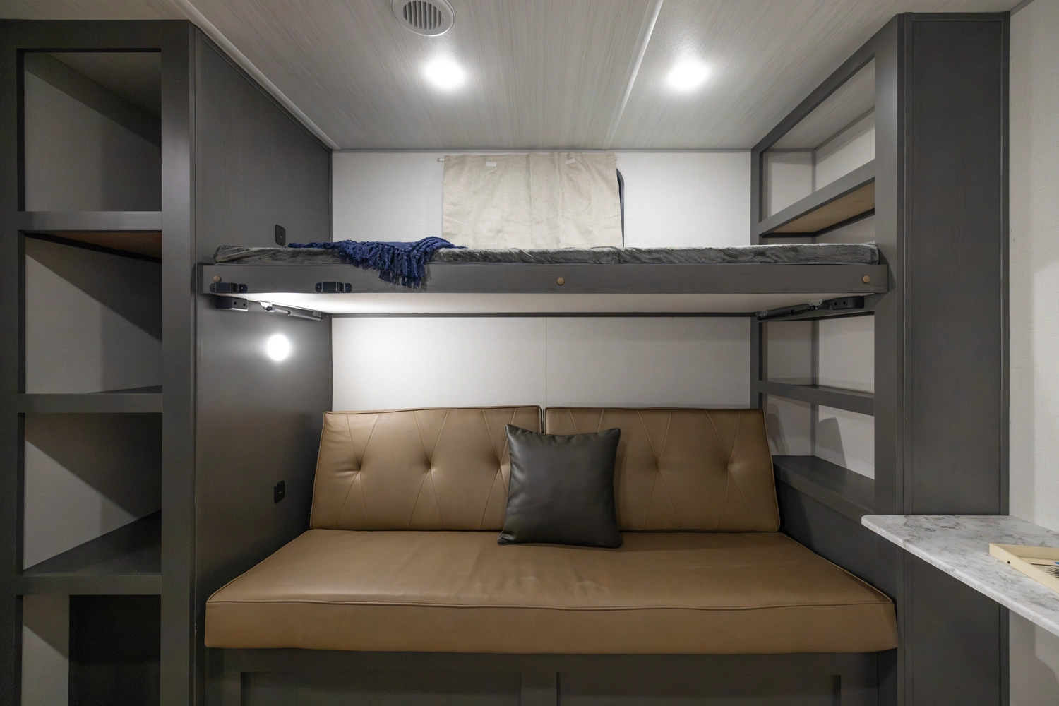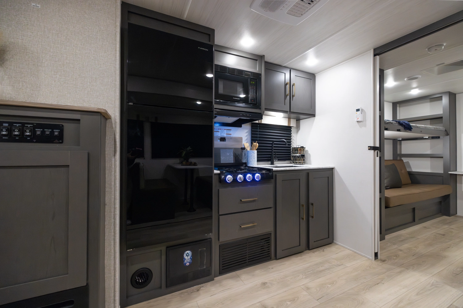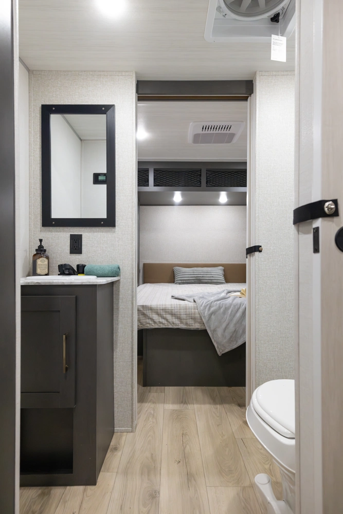 The 2026 Ibex New Trail Edition TRAIL31 offers a front queen bed, a central living area with dinette & sofa, and a private rear bunk room — perfect for kids or guests. It features a walk-through bathroom and a full kitchen with microwave/air-fryer and 10 cu ft fridge. Includes 50-amp service, washer/dryer prep, and a tankless water heater, designed with superior construction.