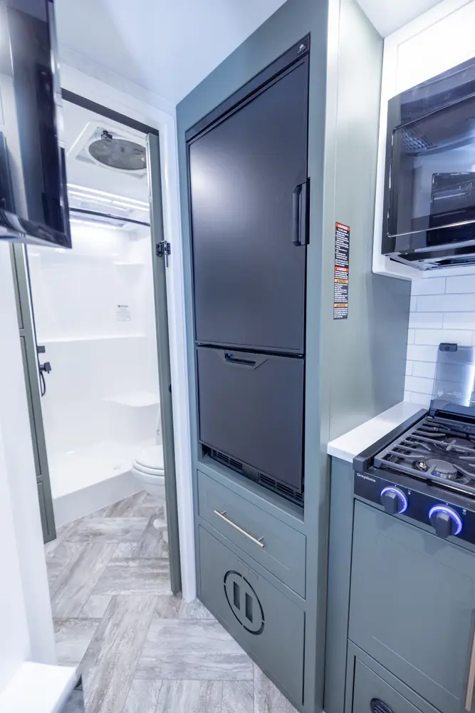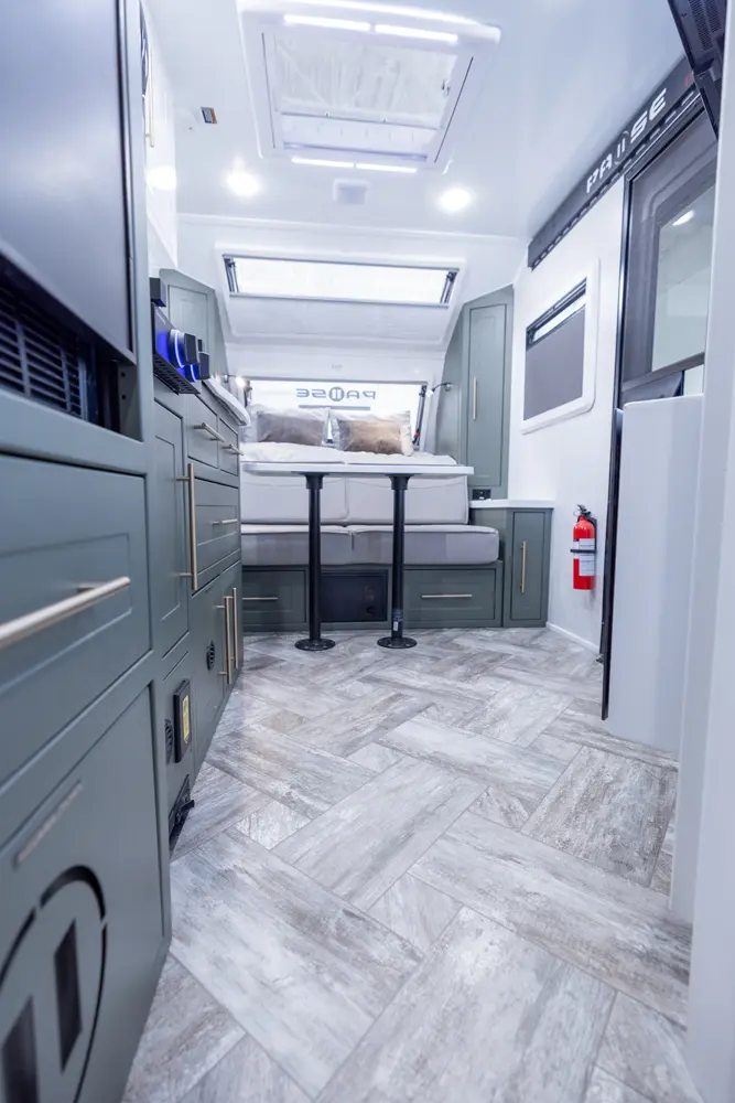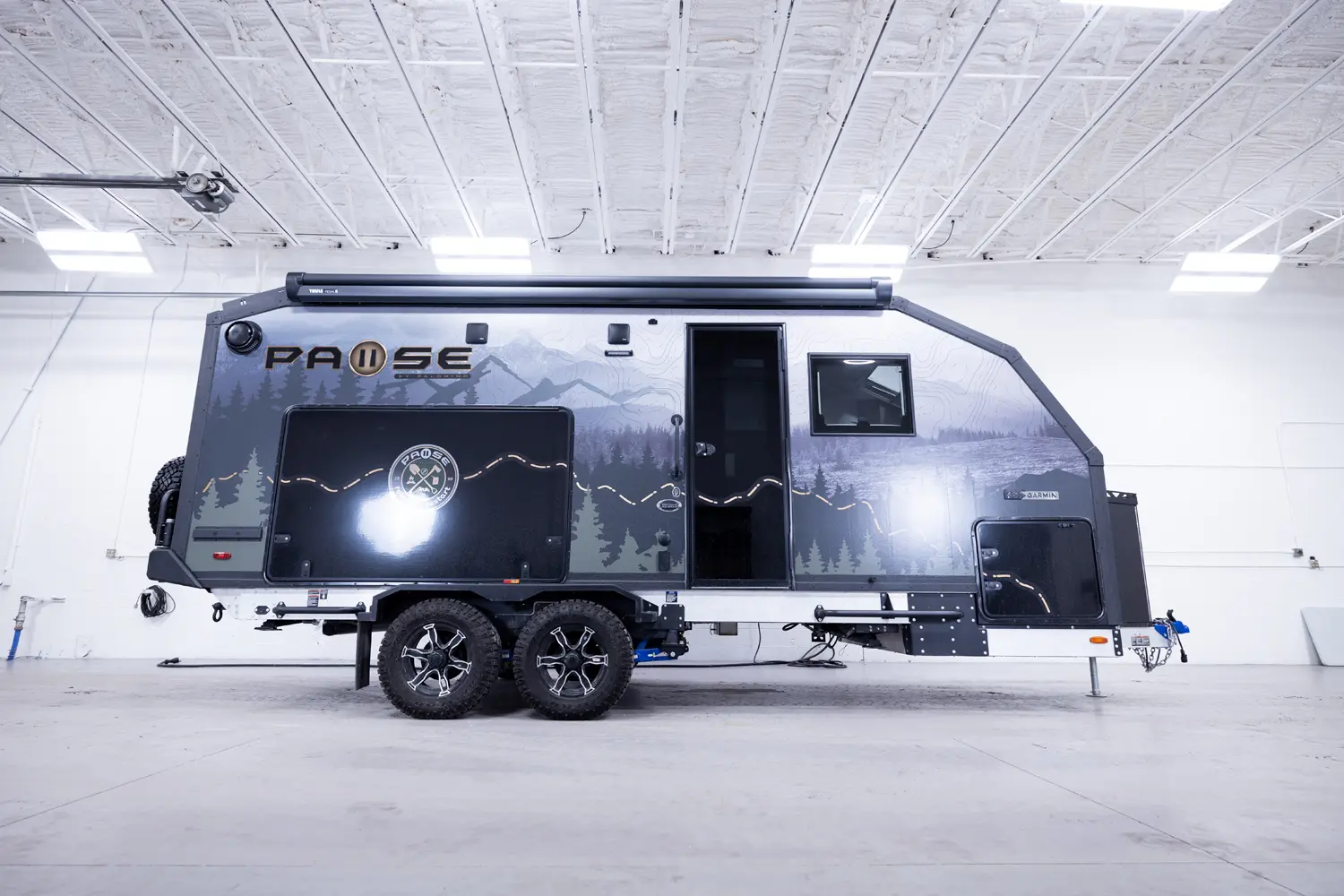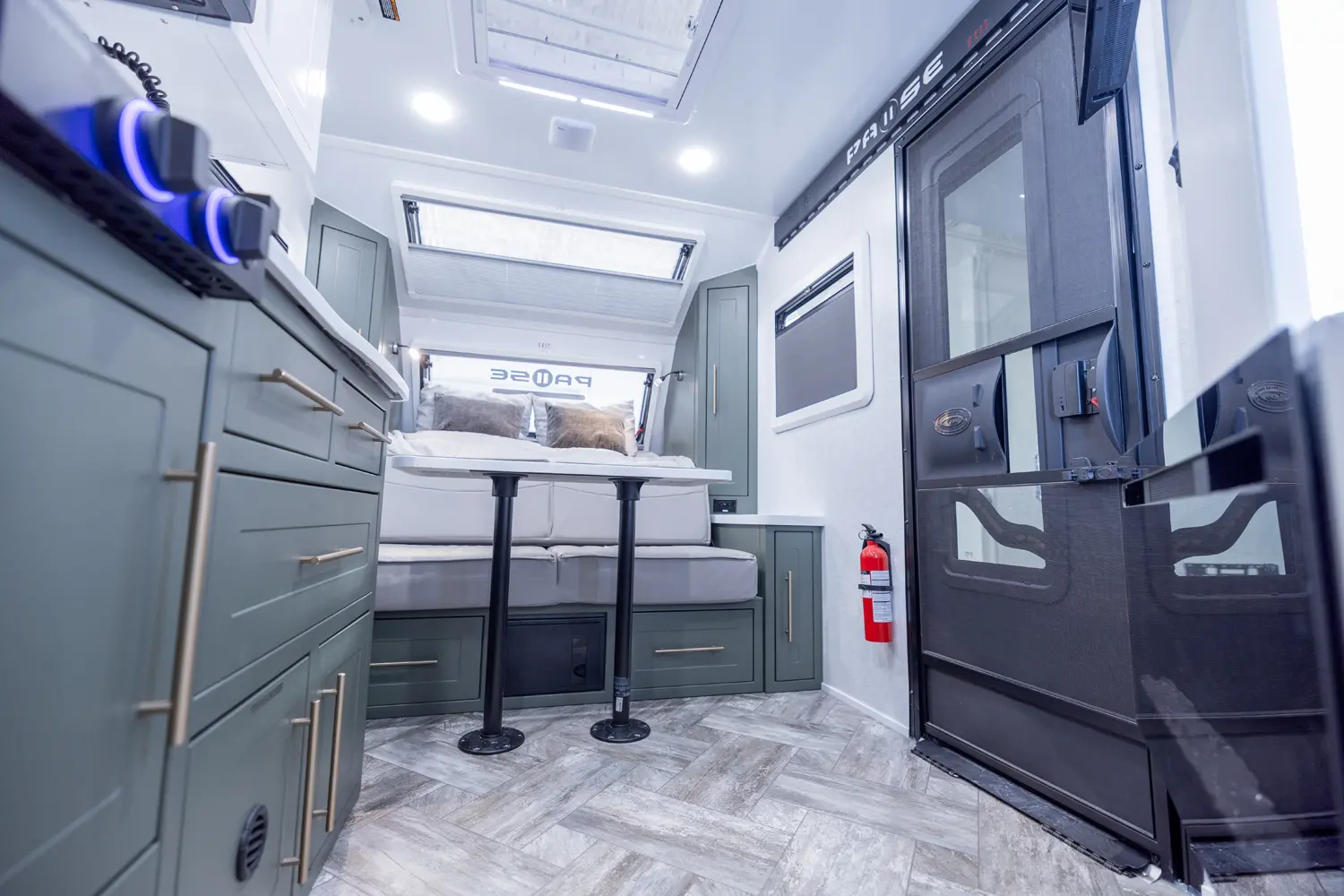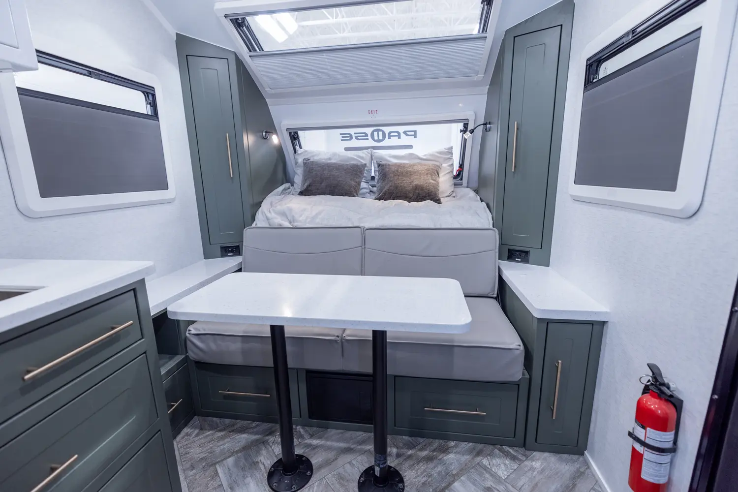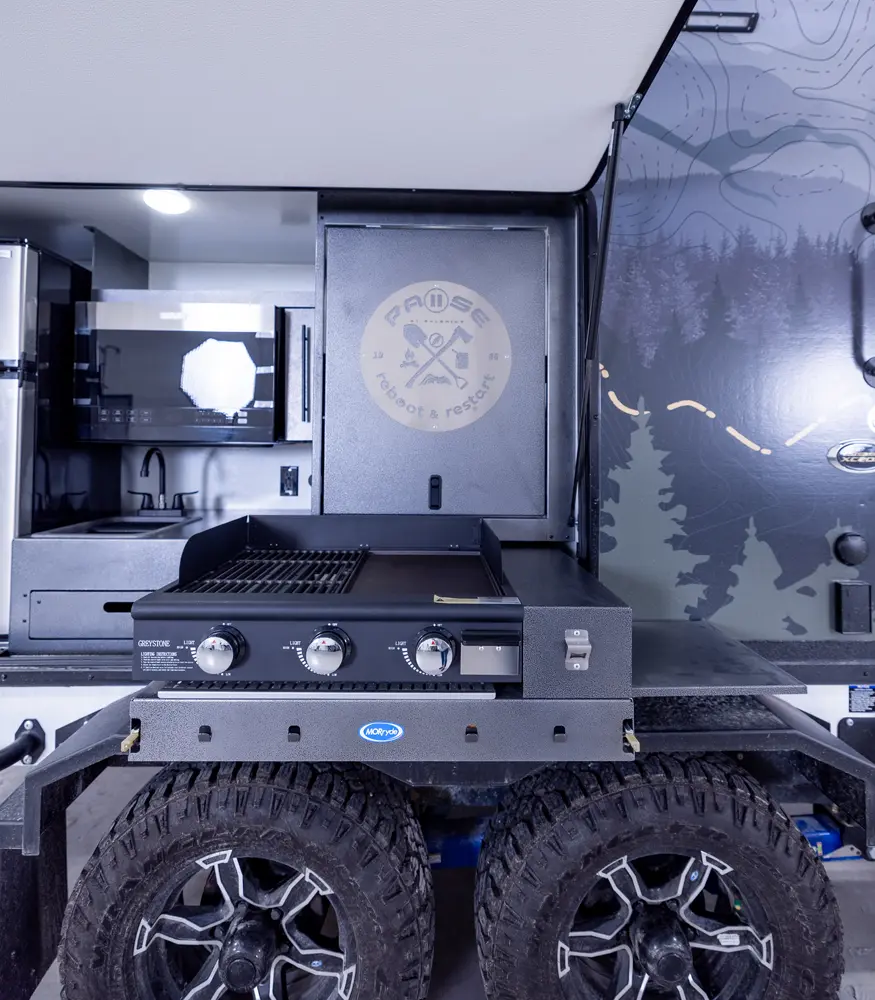 In this Pause floorplan, spend all your time cooking in the great outdoors with the Deluxe Outside Kitchen. With a 4.5 CF Refer, a microwave, sink, a grill and griddle combination and a pantry, you will have everything you need for a large meal. Furthermore, you will be granted with a large storage room in the back of the coach and a lockable storage area behind your entertainment center wall. Enjoy a Full Size Queen bed in the front with shirt closets and outlets on both sides.