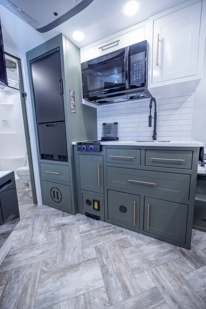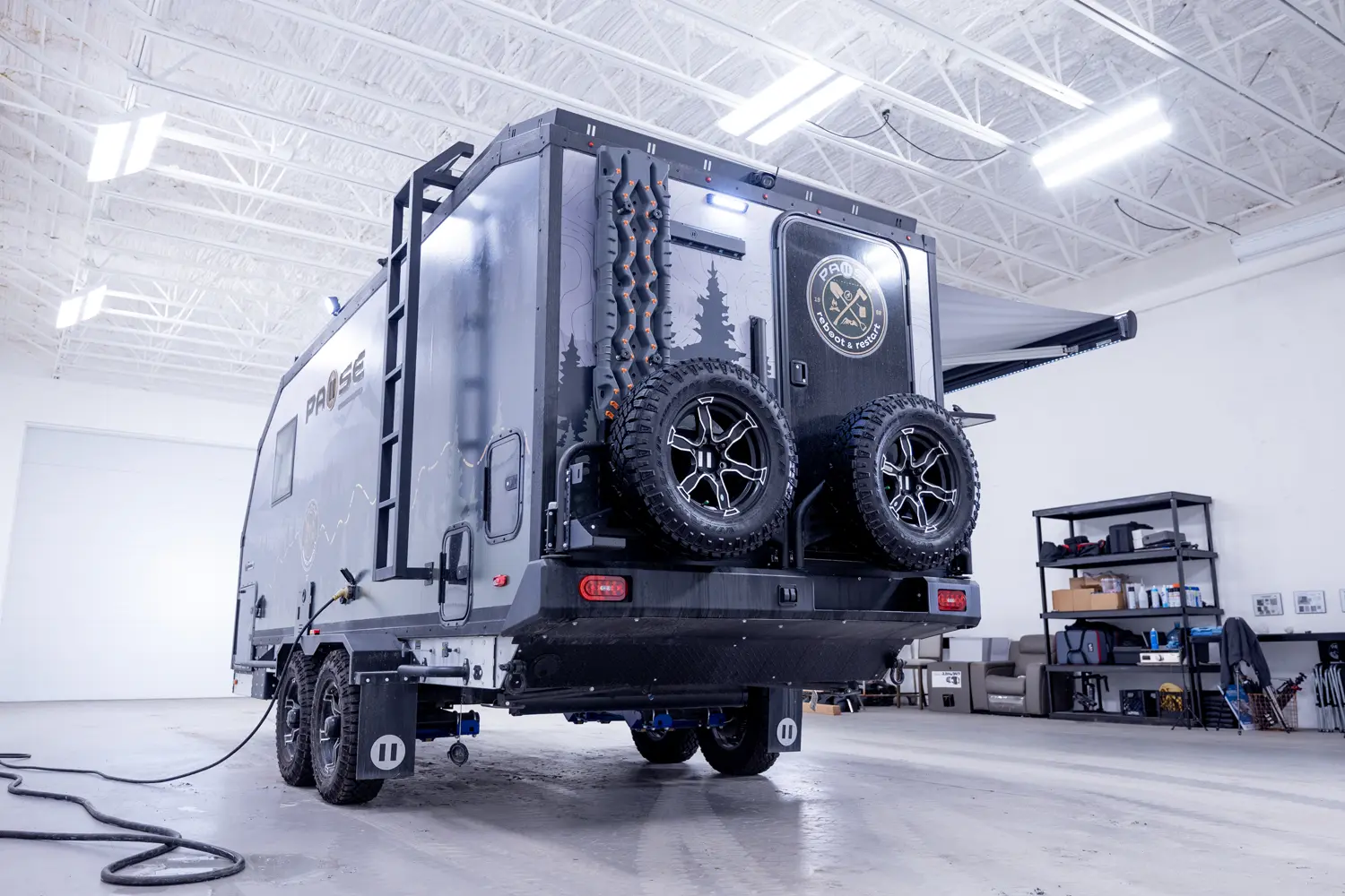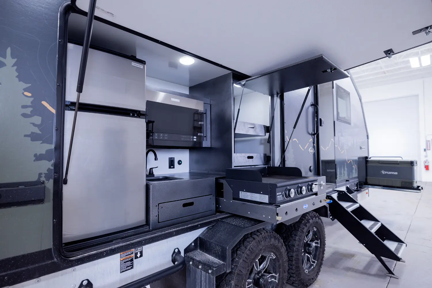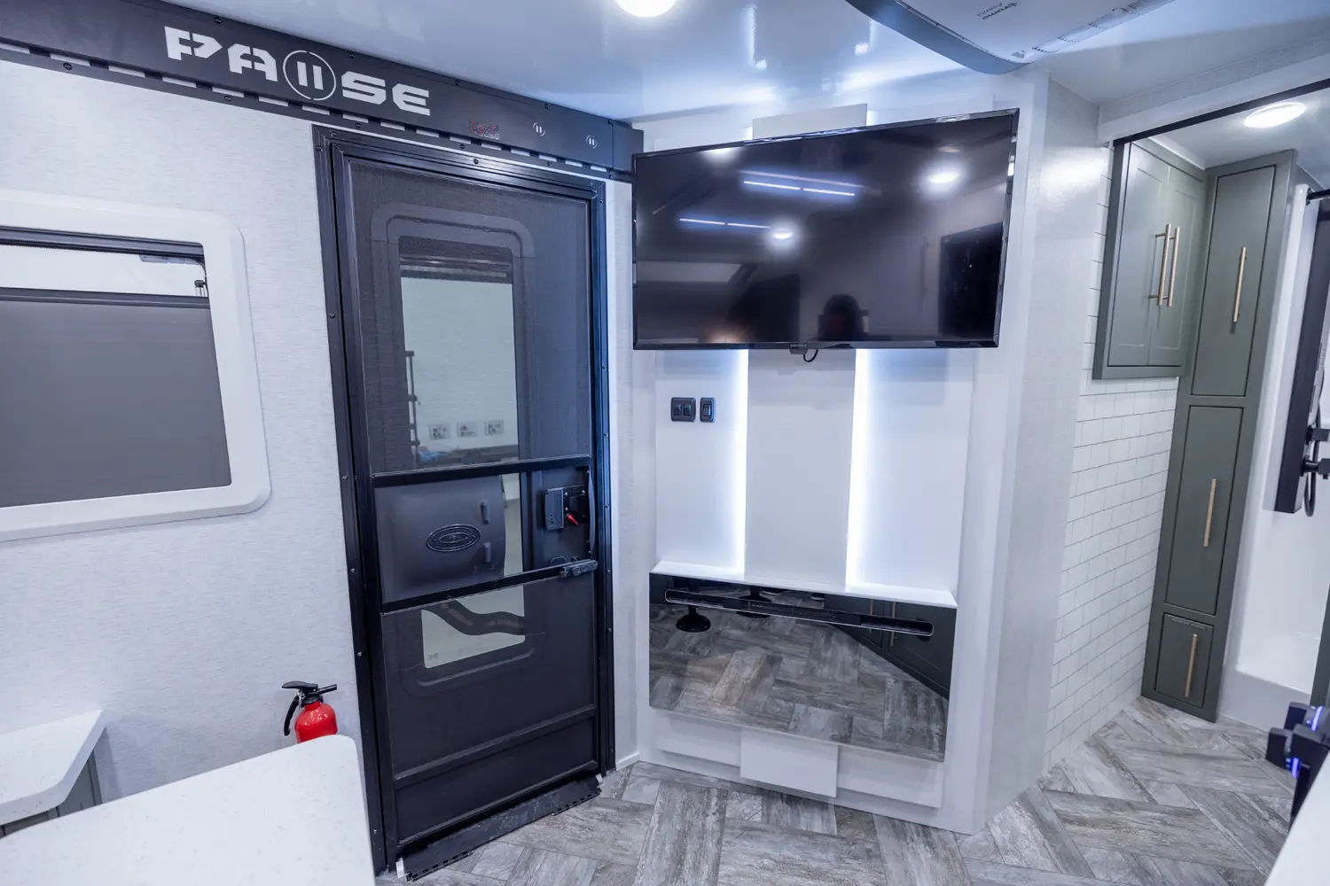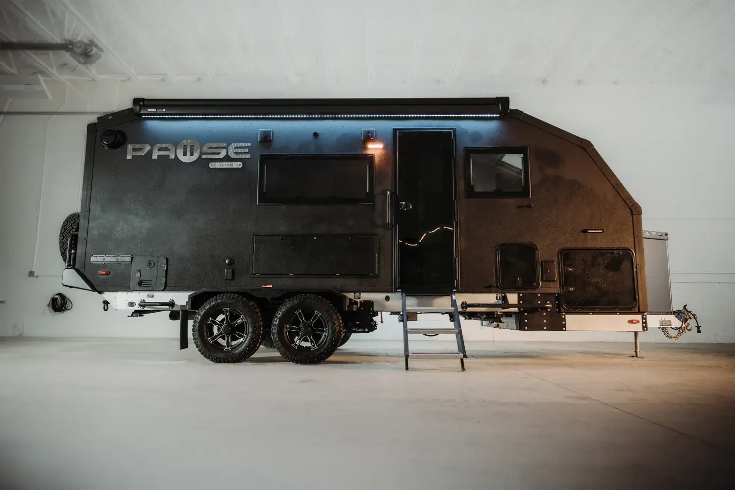 In this Pause floorplan, spend all your time cooking in the great outdoors with the Deluxe Outside Kitchen. With a 4.5 CF Refer, a microwave, sink, a grill and griddle combination and a pantry, you will have everything you need for a large meal. Furthermore, you will be granted with a large storage room in the back of the coach and a lockable storage area behind your entertainment center wall. Enjoy a Full Size Queen bed in the front with shirt closets and outlets on both sides.