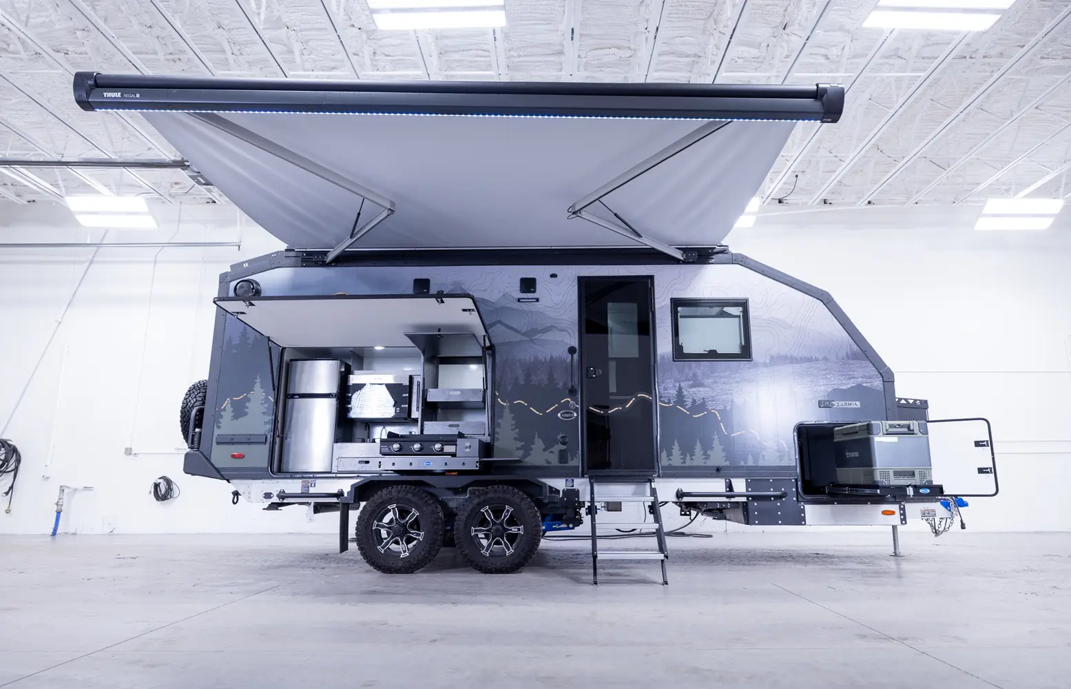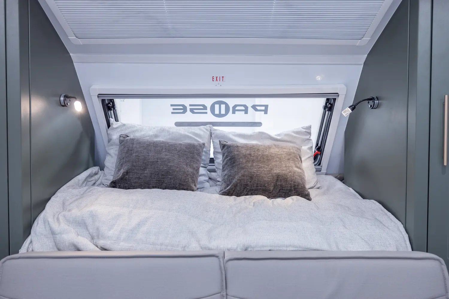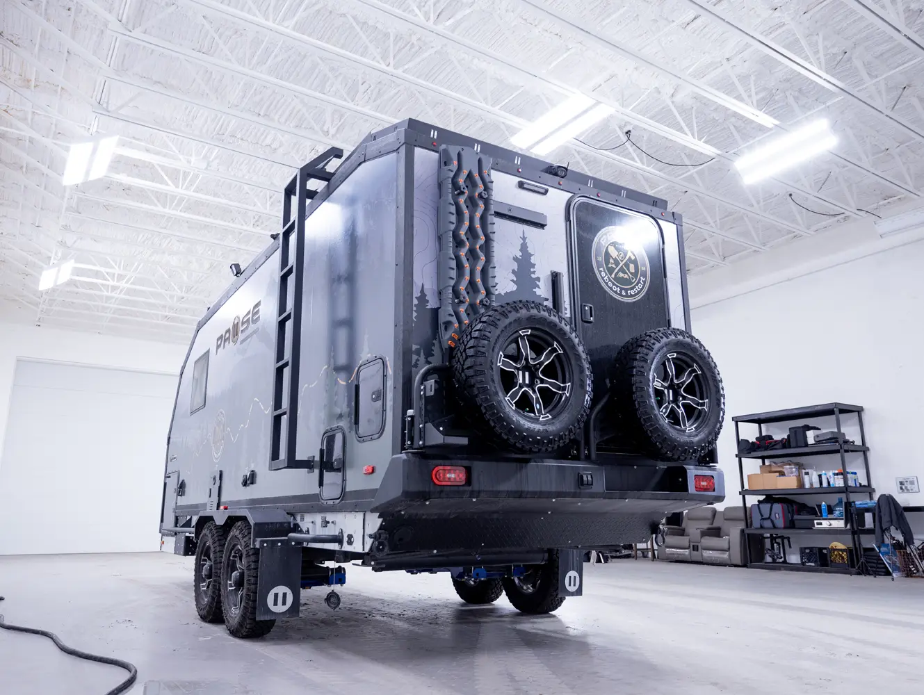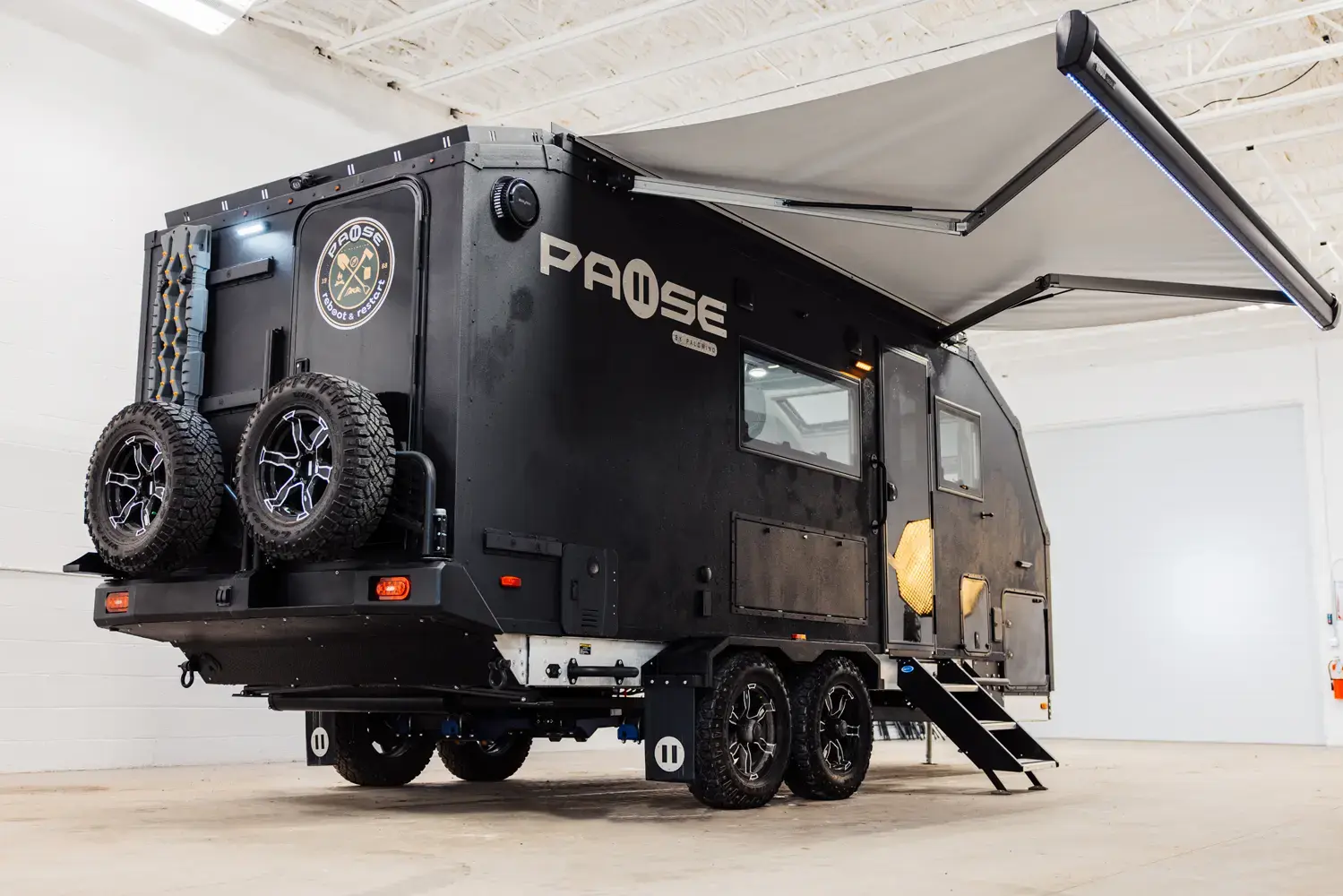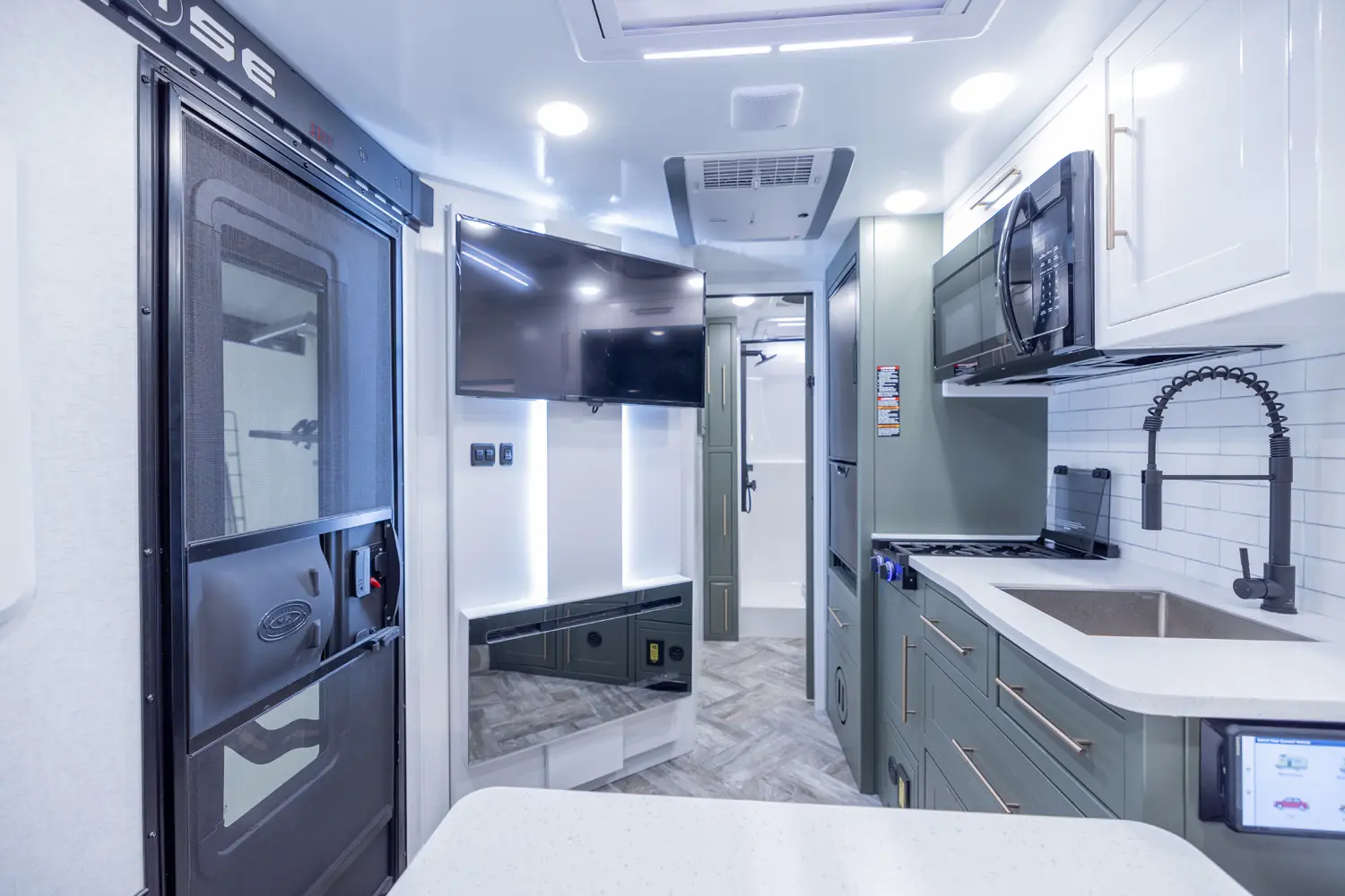 In this Pause floorplan, spend all your time cooking in the great outdoors with the Deluxe Outside Kitchen. With a 4.5 CF Refer, a microwave, sink, a grill and griddle combination and a pantry, you will have everything you need for a large meal. Furthermore, you will be granted with a large storage room in the back of the coach and a lockable storage area behind your entertainment center wall. Enjoy a Full Size Queen bed in the front with shirt closets and outlets on both sides.