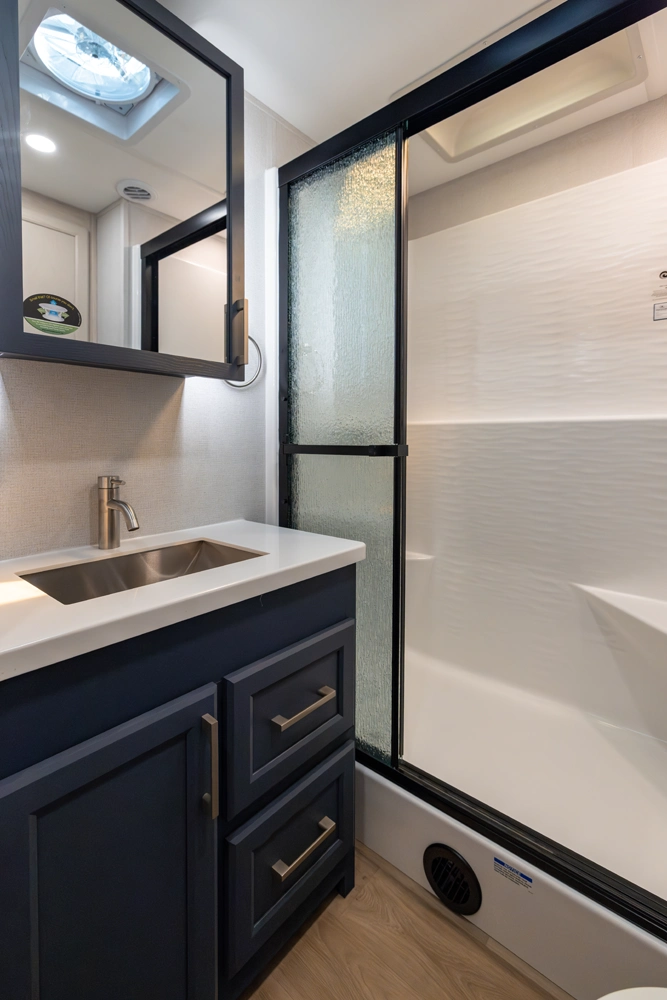 • Stainless Steel Appliance Pkg including 18 cu ft. 12V Refer, 1.7 Cu Ft Microwave and Residential Style 24" Range