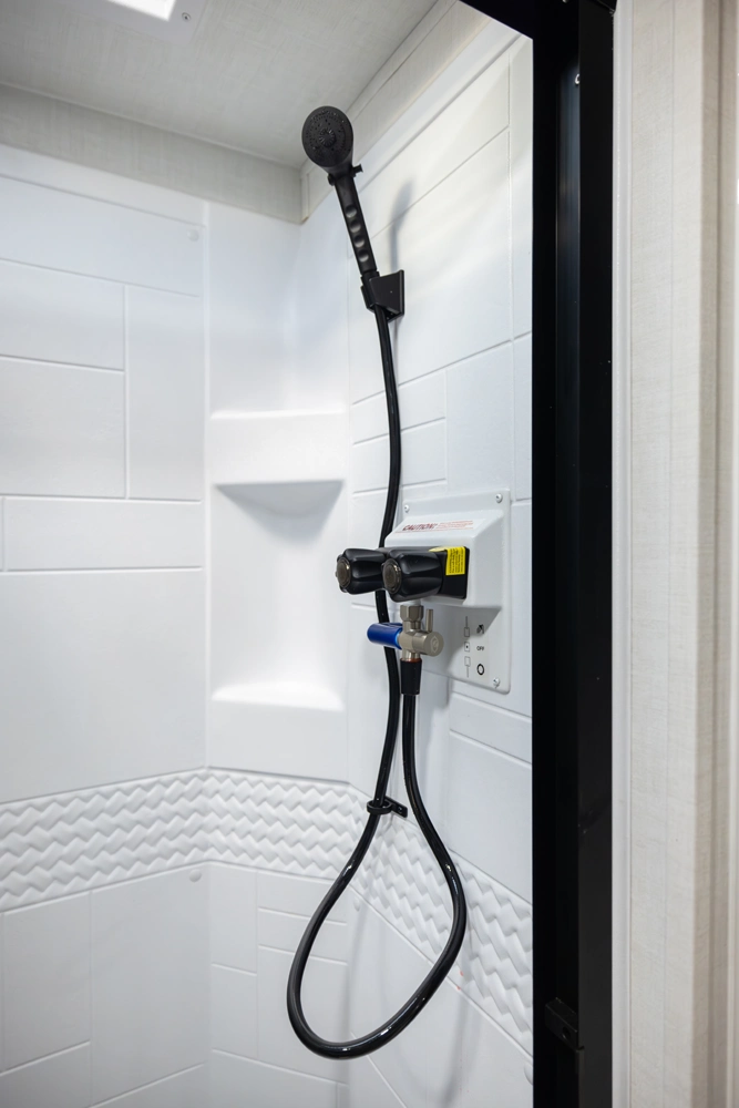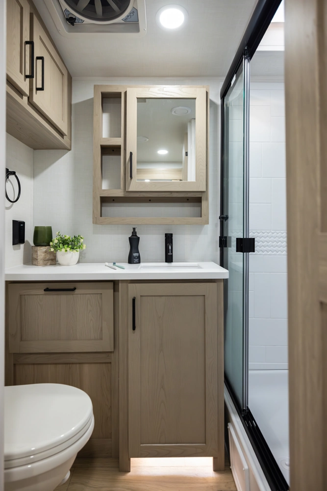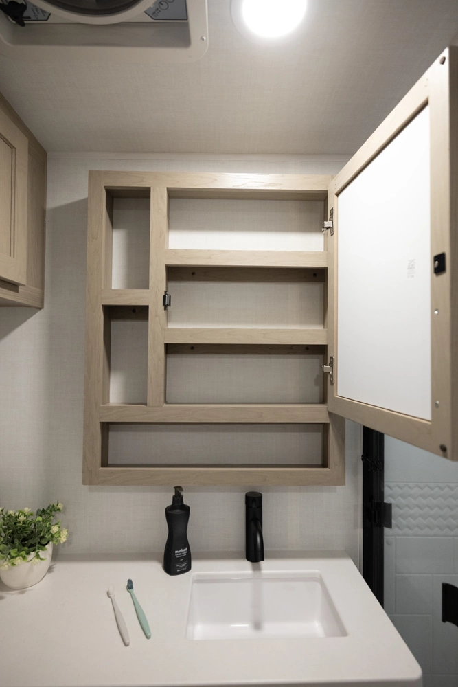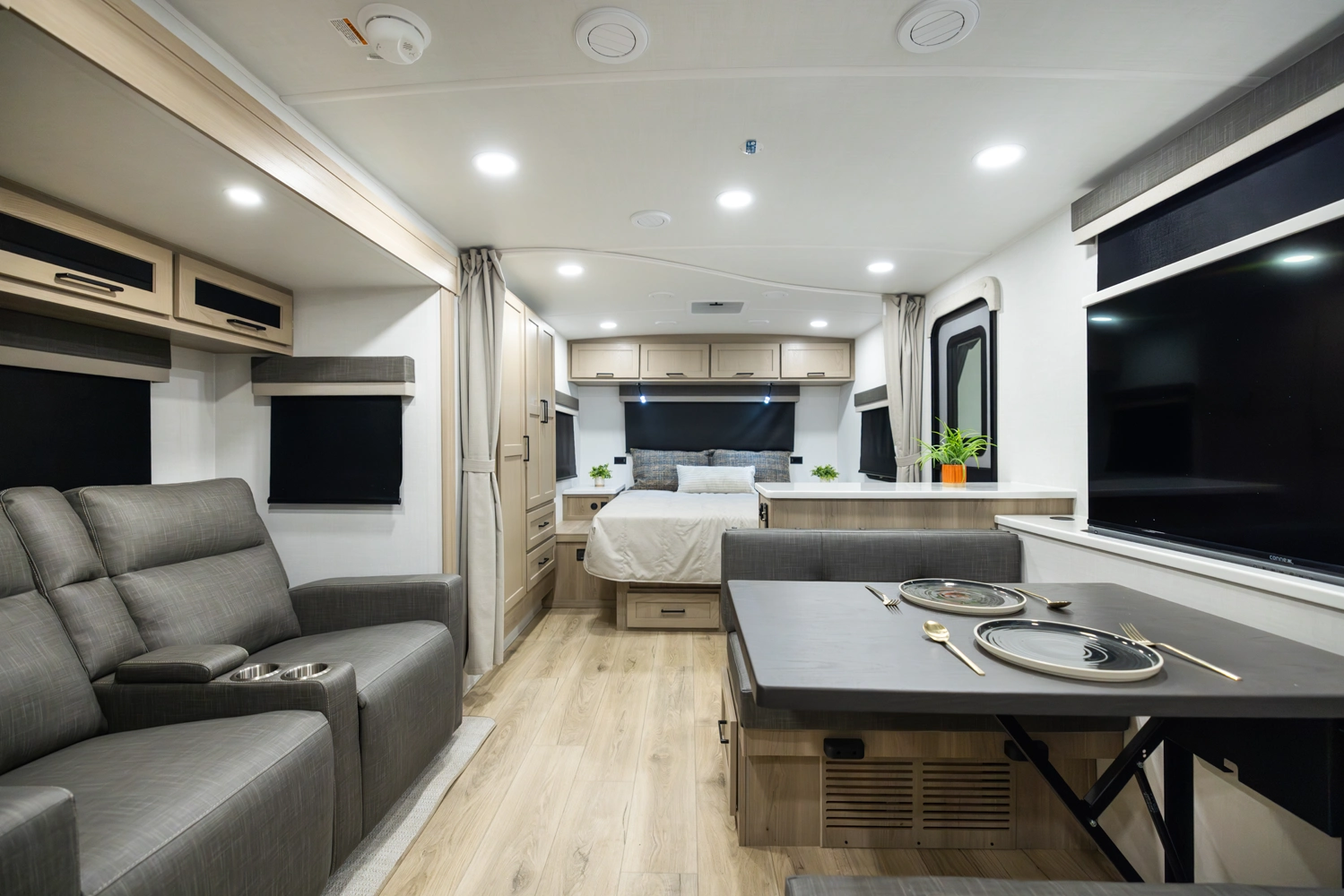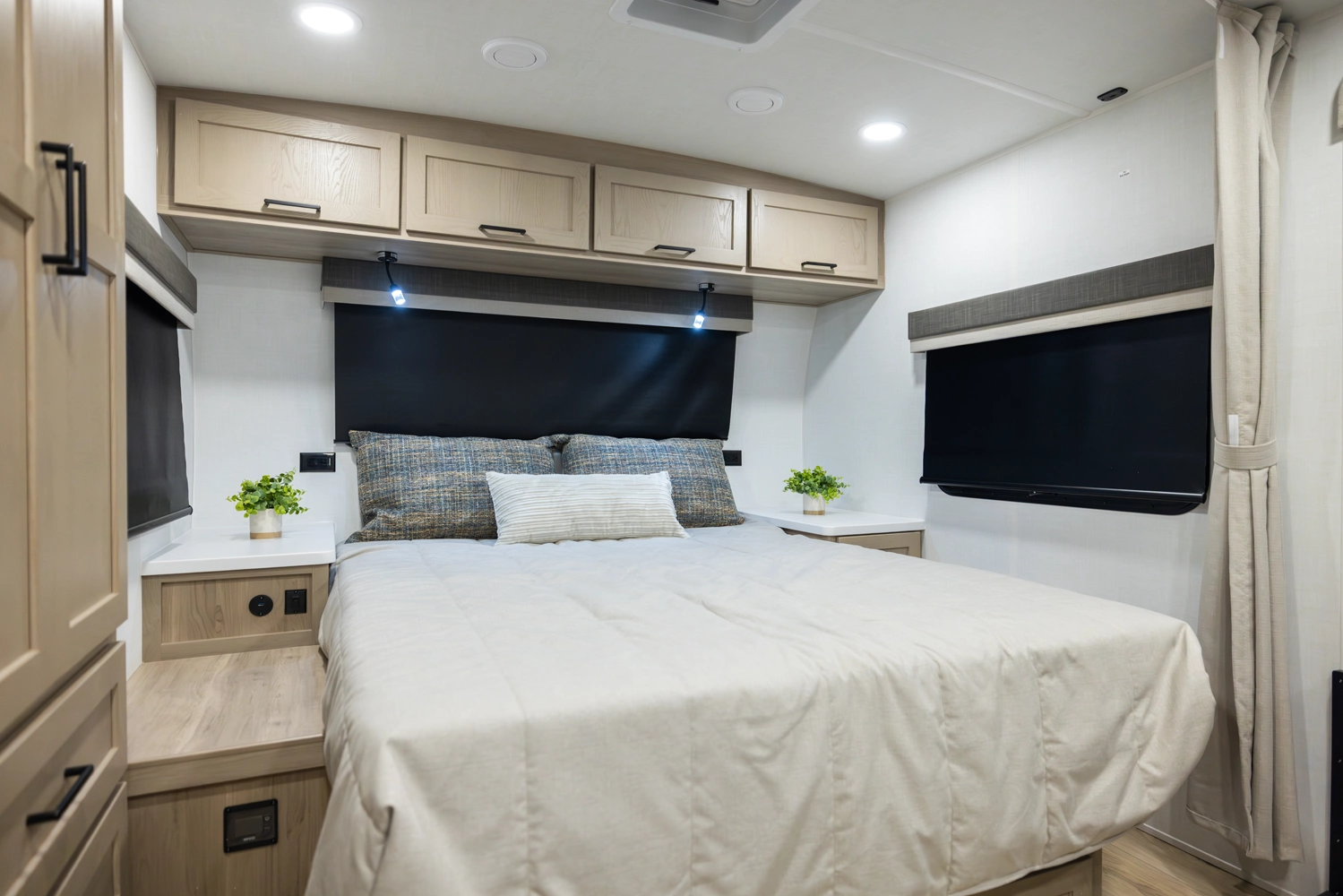 The 2522FB is a beautiful front bedroom floor plan featuring a unique wardrobe/pantry slideout for exceptional storage and organization. The living area includes theater seating directly across from the adjustable “televator” which raises for TV viewing and lowers so you can enjoy the massive door side window views. A versatile dinette and spacious rear kitchen with plenty of counter space completes the thoughtful design.