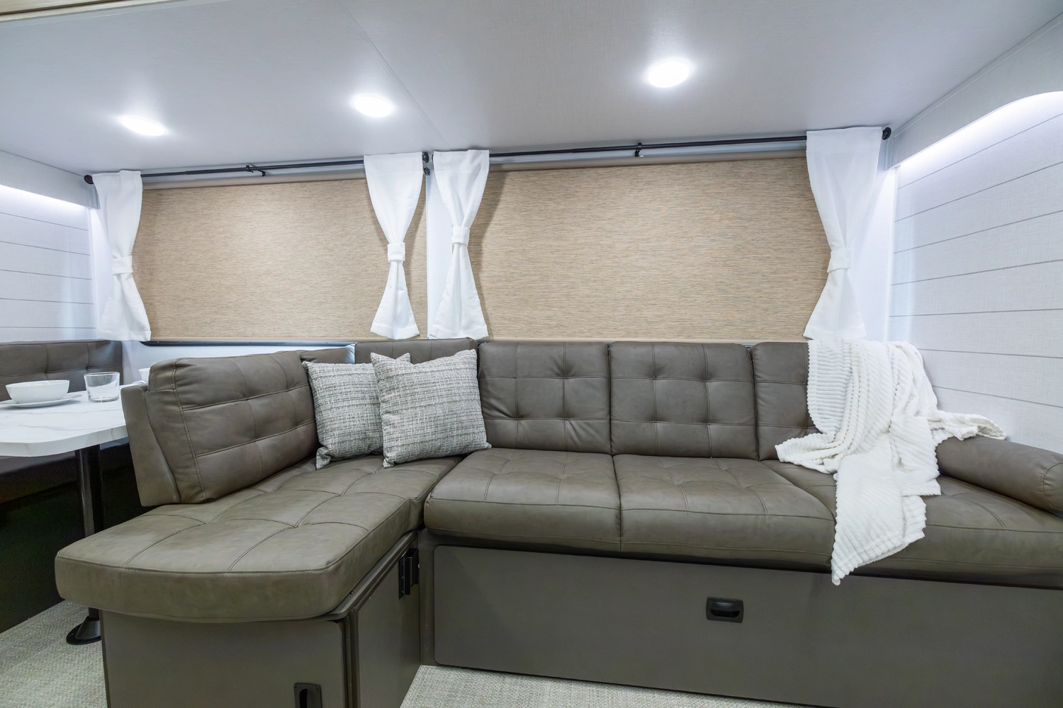 The 31KQBTS is the ultimate bunkhouse, with three total slide outs and an outside kitchen. This well-equipped travel trailer features oversized panoramic windows, the ever-popular U-dinette, which you can customize with the adjacent Versa-Lounge. The kitchen includes a 11 CU. FT. refrigerator and stovetop with oven and LED accents, plus cabinets for all your cooking essentials!