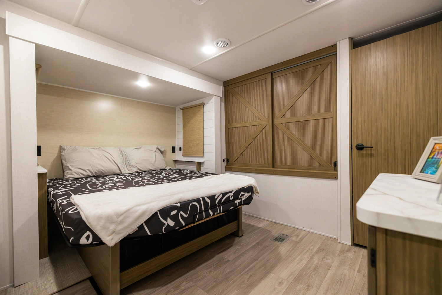 The 33TS is the ultimate bunkhouse, with three total slide outs and an outside kitchen. This well-equipped travel trailer features oversized panoramic windows and the desirable Versa-Lounge. The back-bunk room features the Versa-Queen giving this floorplan the option for two queen beds!