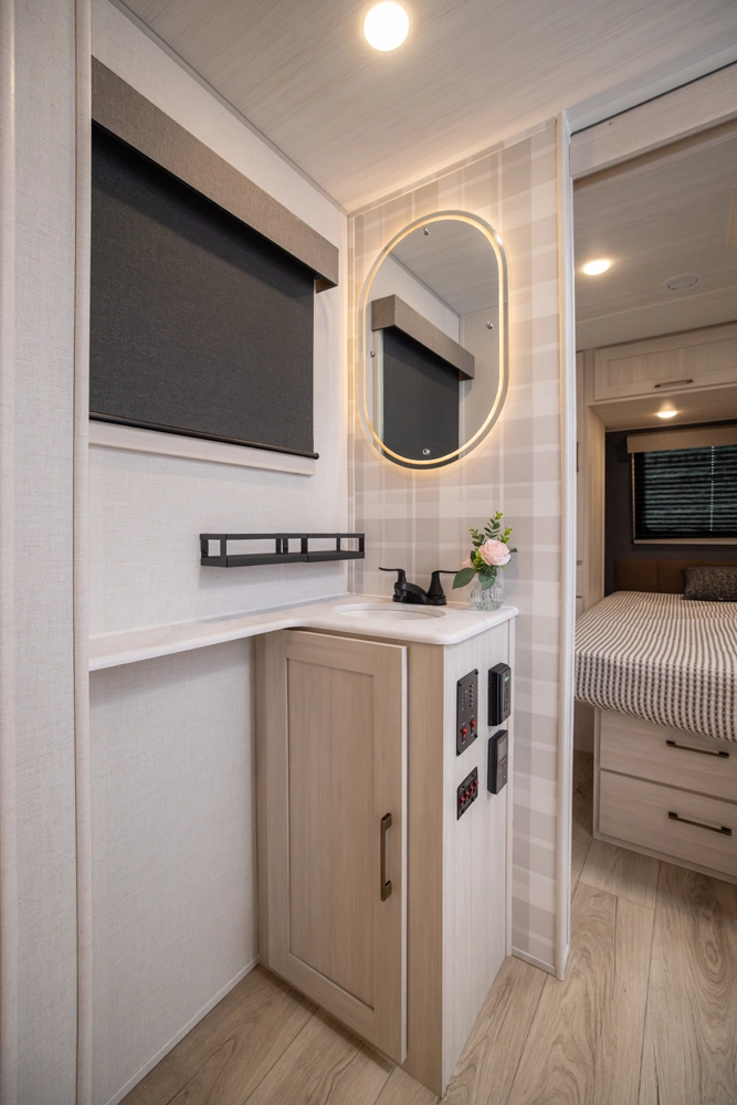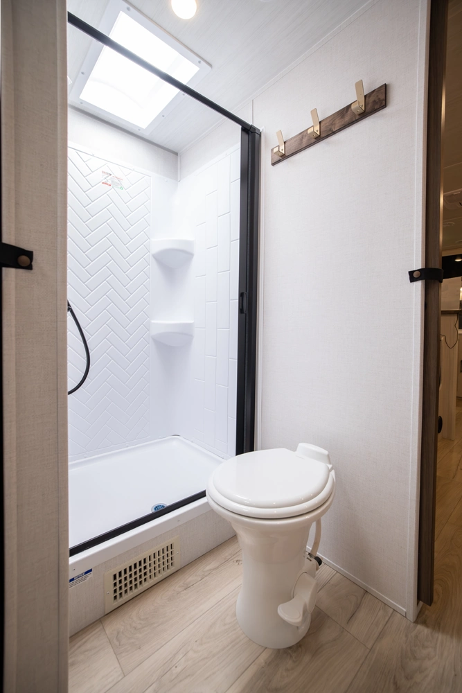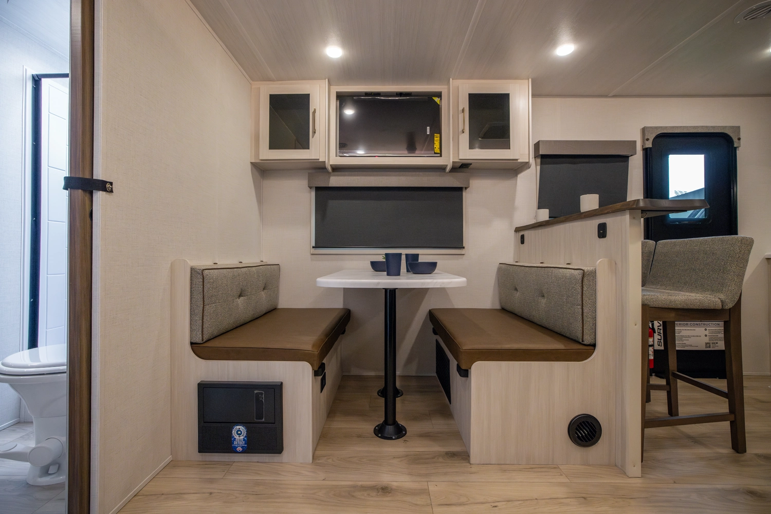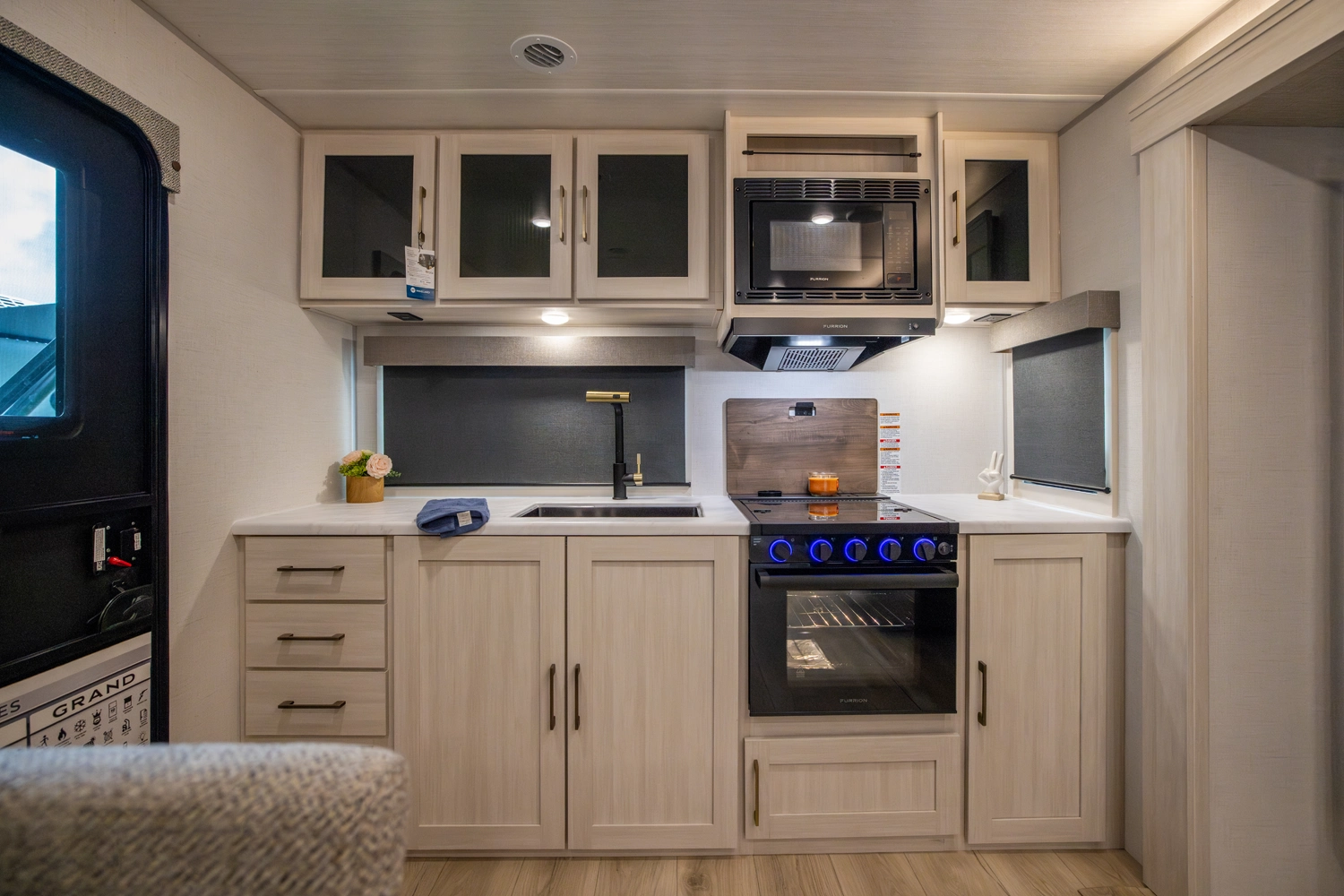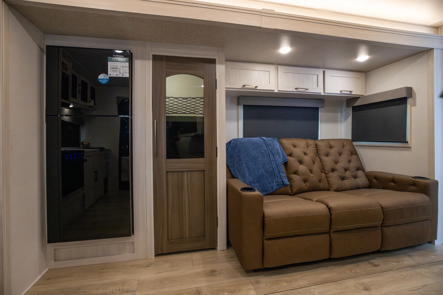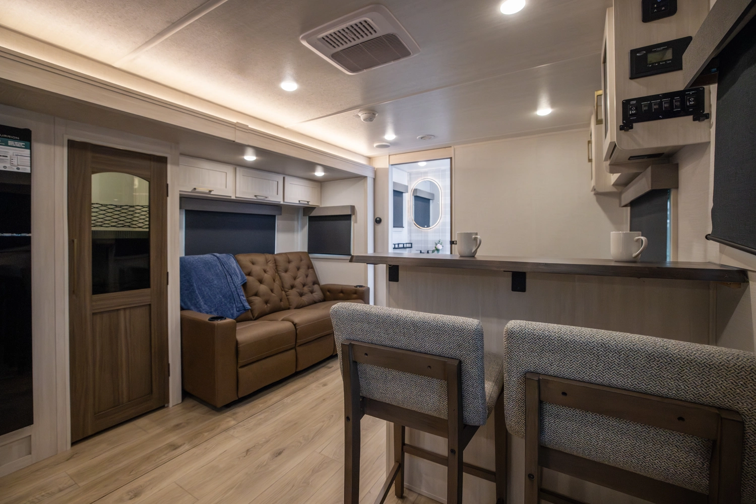 This 30' travel trailer features a rear kitchen with a 10 cu. ft. 12V refrigerator and stovetop. The front private bedroom includes a queen bed with dual wardrobes and overhead storage. Living space includes a tri-fold sofa and a breakfast bar. Exterior amenities include a 21' power awning with LED lights and pass-through storage.