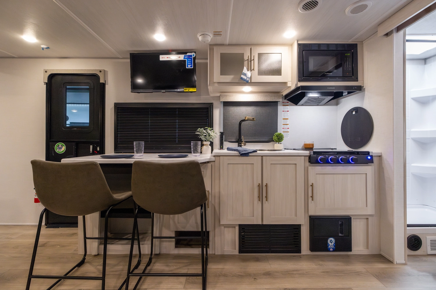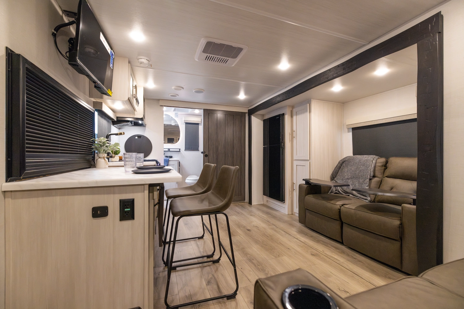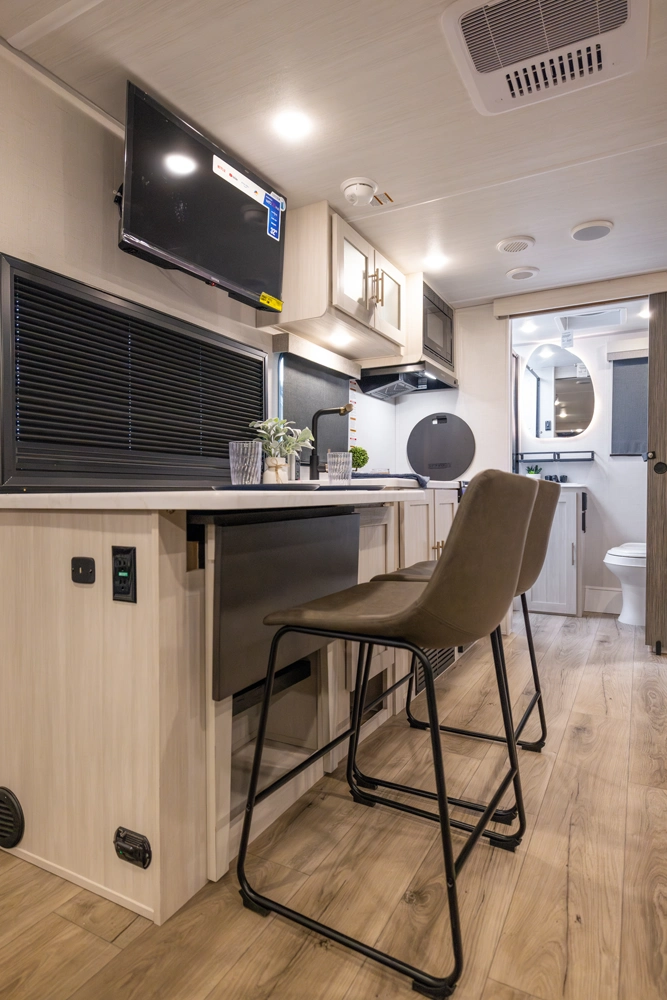 The Un•Mapped 26ML features a 12V black glass refrigerator and an air fryer microwave. The Bar2Table pull-out dinette and TrailGate outdoor bar enhance dining flexibility and outdoor entertaining. Inside, enjoy a private custom king bed, 15K A/C, and a tankless on-demand water heater. Exterior amenities include a 21' powered awning, outdoor camp kitchen, and a hot & cold spray port.