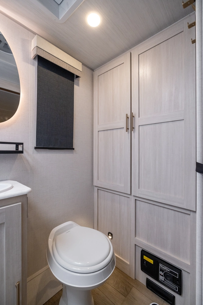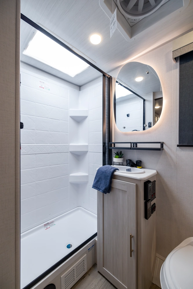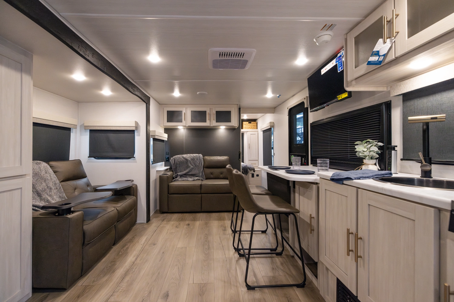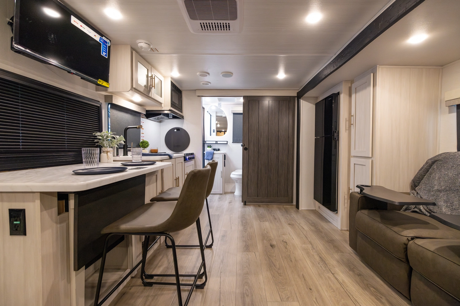 The Un•Mapped 26ML features a 12V black glass refrigerator and an air fryer microwave. The Bar2Table pull-out dinette and TrailGate outdoor bar enhance dining flexibility and outdoor entertaining. Inside, enjoy a private custom king bed, 15K A/C, and a tankless on-demand water heater. Exterior amenities include a 21' powered awning, outdoor camp kitchen, and a hot & cold spray port.