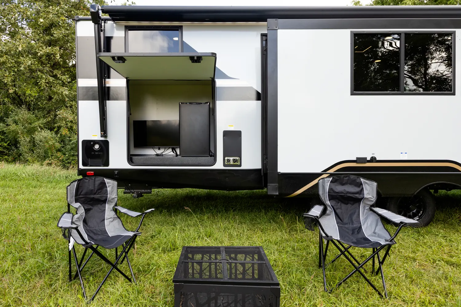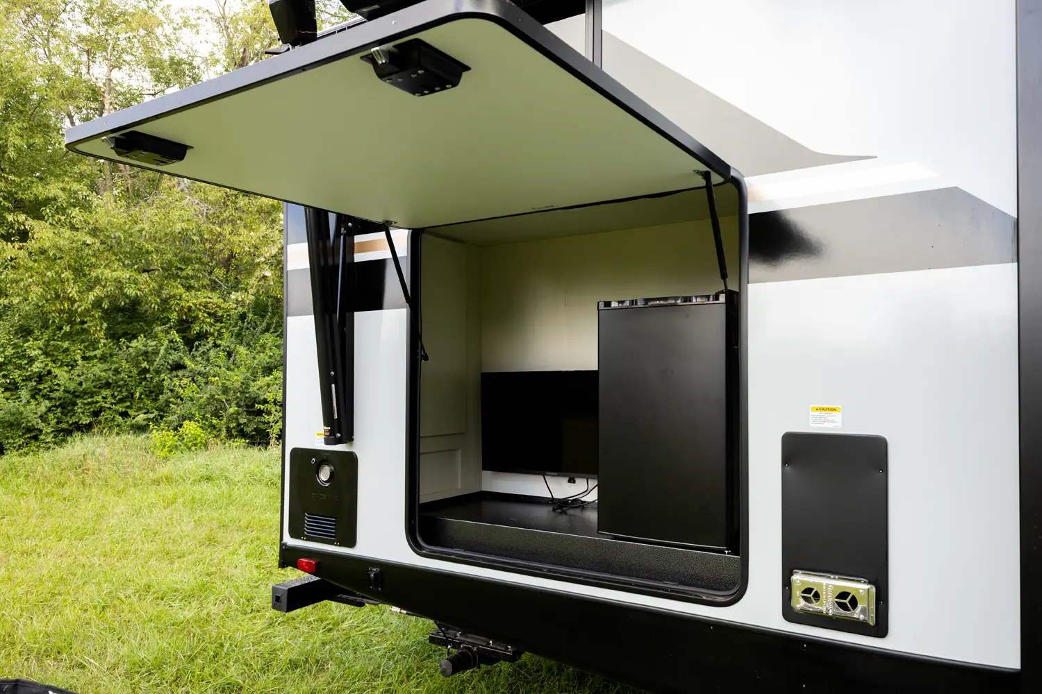 • Universal Docking Station Enclosed in Cargo Storage - Hookups Included: Cable & Satellite Switch, Fresh-Tank Gravity Fill, City Water, Black Tank Flush, Winterization Pump, Outdoor Shower, GFI Outlet, And Space Prepped for Solar Panel Controller