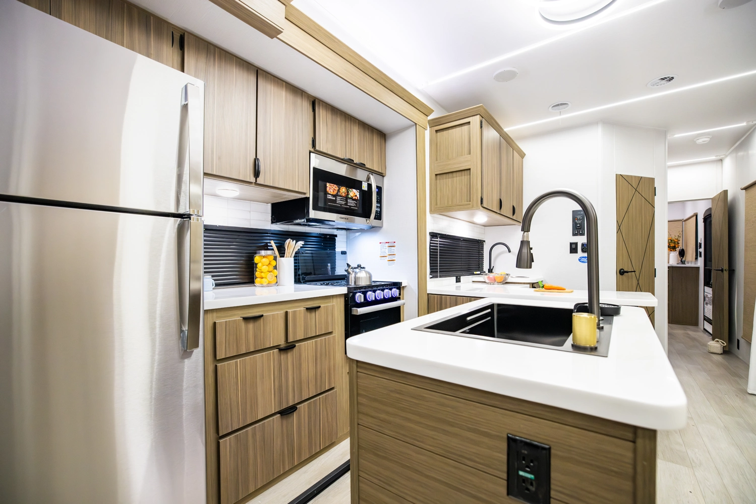 The 40RLB is an open floorplan that maximizes space for a residential cottage look and feel. The large king bedroom provides plenty of storage and washer/dryer hookup. The bathroom offers a walk-in shower with built-in seat, skylight, and linen cabinets. The island kitchen provides residential appliances and plenty of room for all the cooking essentials. Don’t forget the awesome view out the panoramic windows.