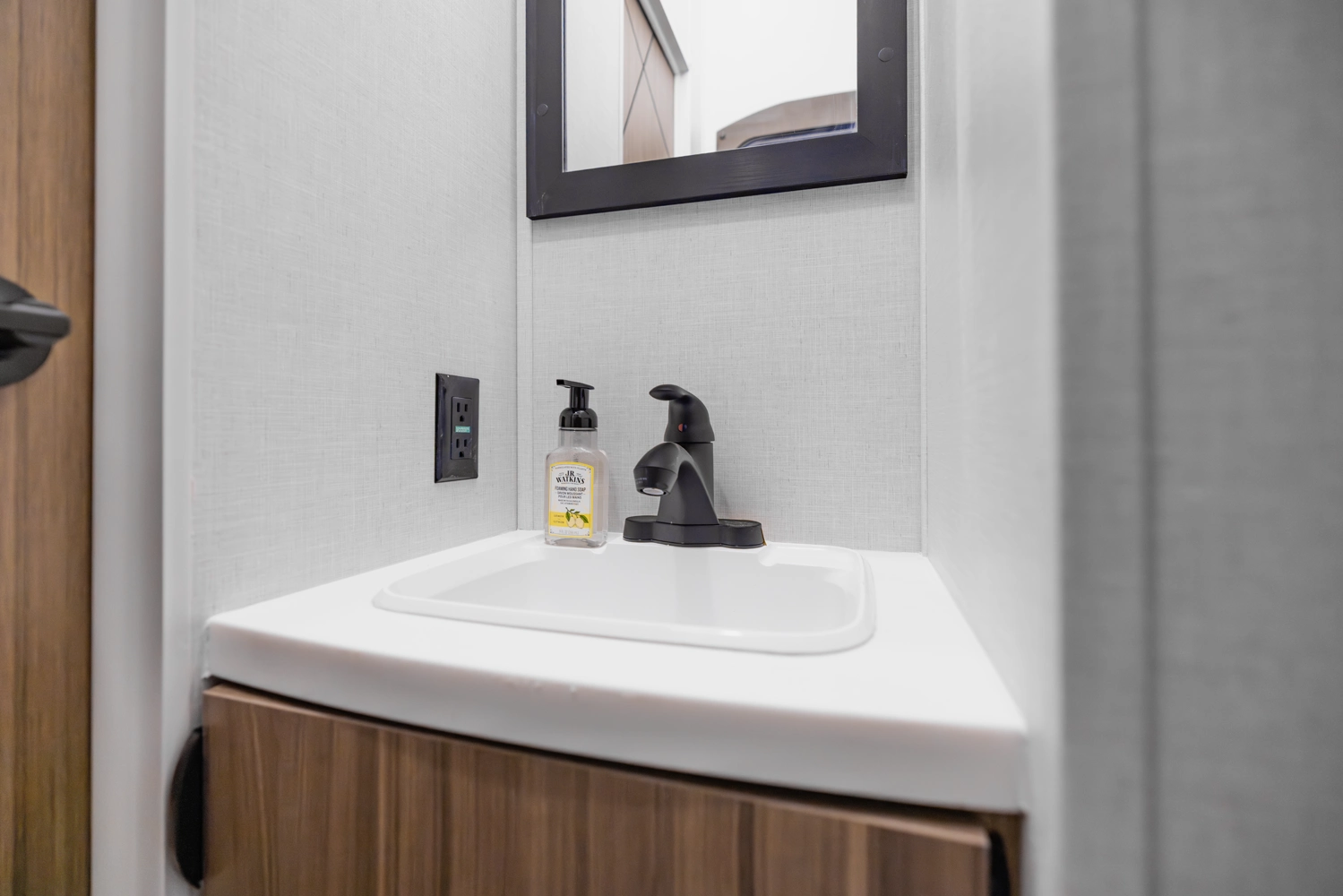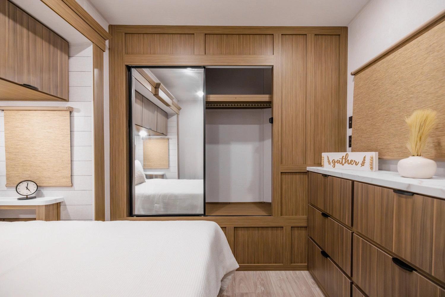 The 42QBQ is the ultimate bunkhouse, with four slides and an outdoor kitchen. The large front queen bedroom includes plenty of closet and cabinet space, while the adjacent bathroom gives you a walk-in radius shower. The living area features panoramic windows, fireplace (heater), and a tri-fold sofa. The bunk room provides 3 bunks plus the Versa-Queen giving the option of having another bunk, sofa, or queen bed. Do not forget the half bath with convenient door to the outside.