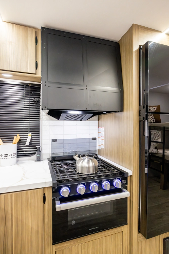 The 26DBUD is the perfect family travel trailer, with double bunks at one end and a queen bedroom at the other. You also get a fireplace (heater), full kitchen with glass-fronted cabinetry and large pantry, a U-dinette, and the customizable Versa-Lounge with Stow N Go Storage.