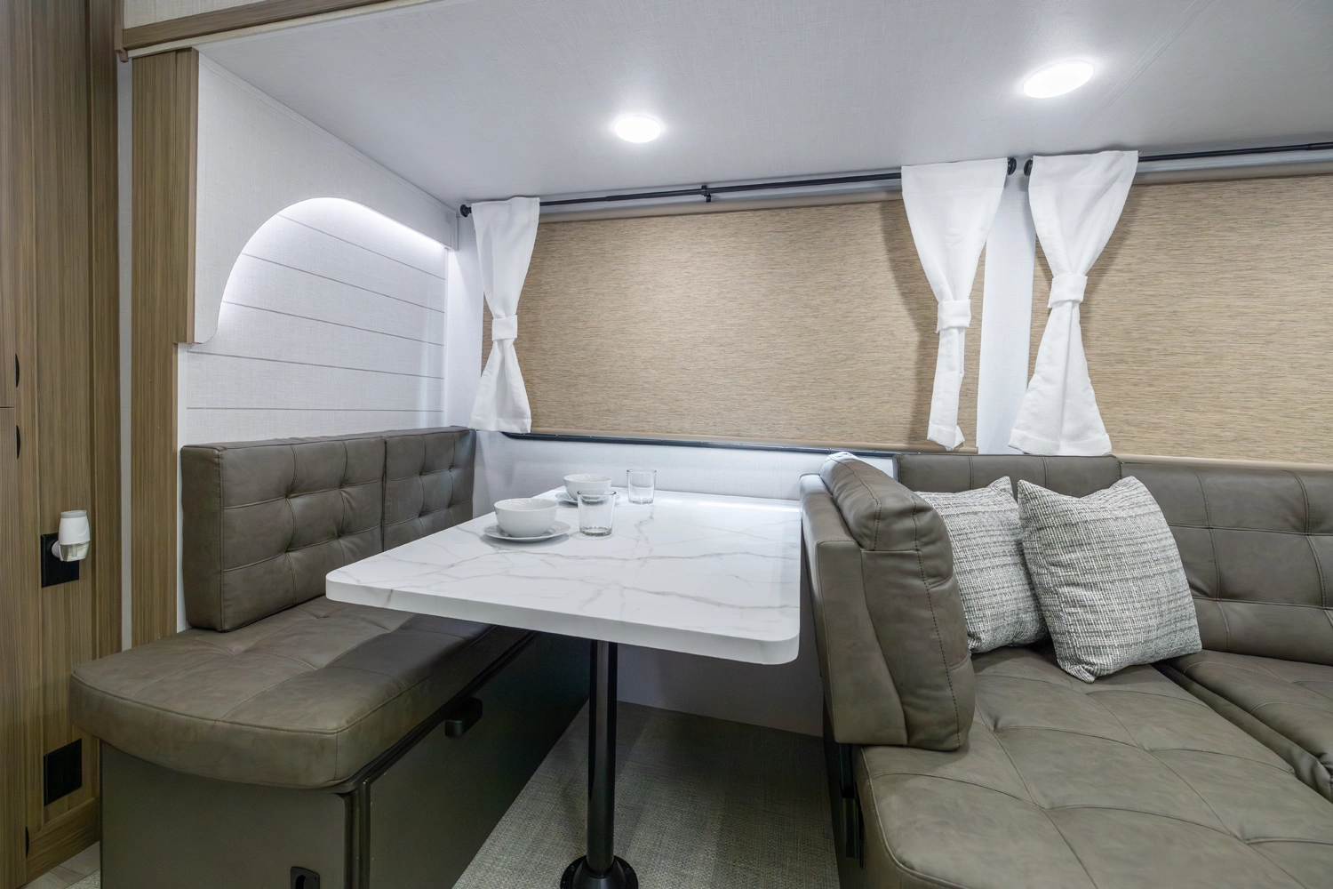 The 31KQBTS is the ultimate bunkhouse, with three total slide outs and an outside kitchen. This well-equipped travel trailer features oversized panoramic windows, the ever-popular U-dinette, which you can customize with the adjacent Versa-Lounge. The kitchen includes a 11 CU. FT. refrigerator and stovetop with oven and LED accents, plus cabinets for all your cooking essentials!
